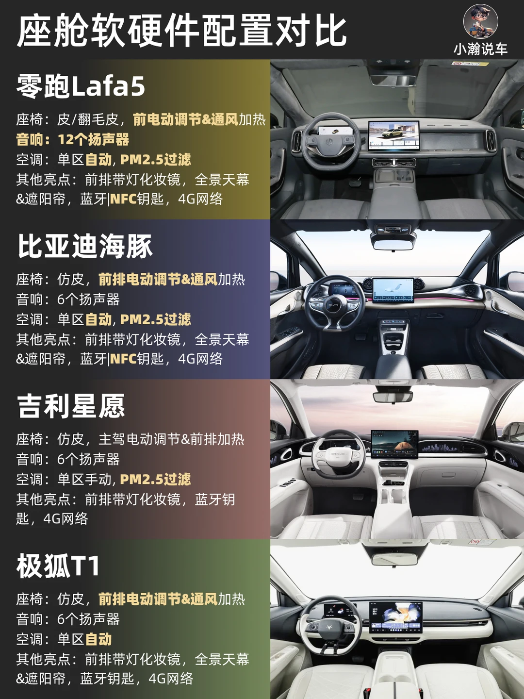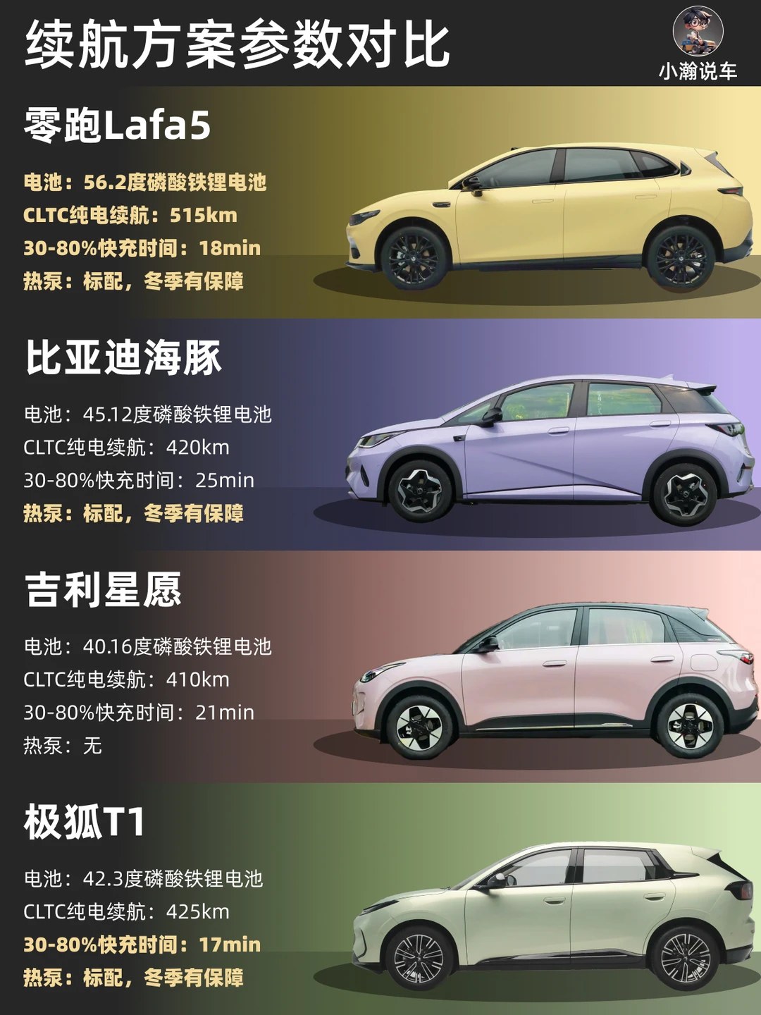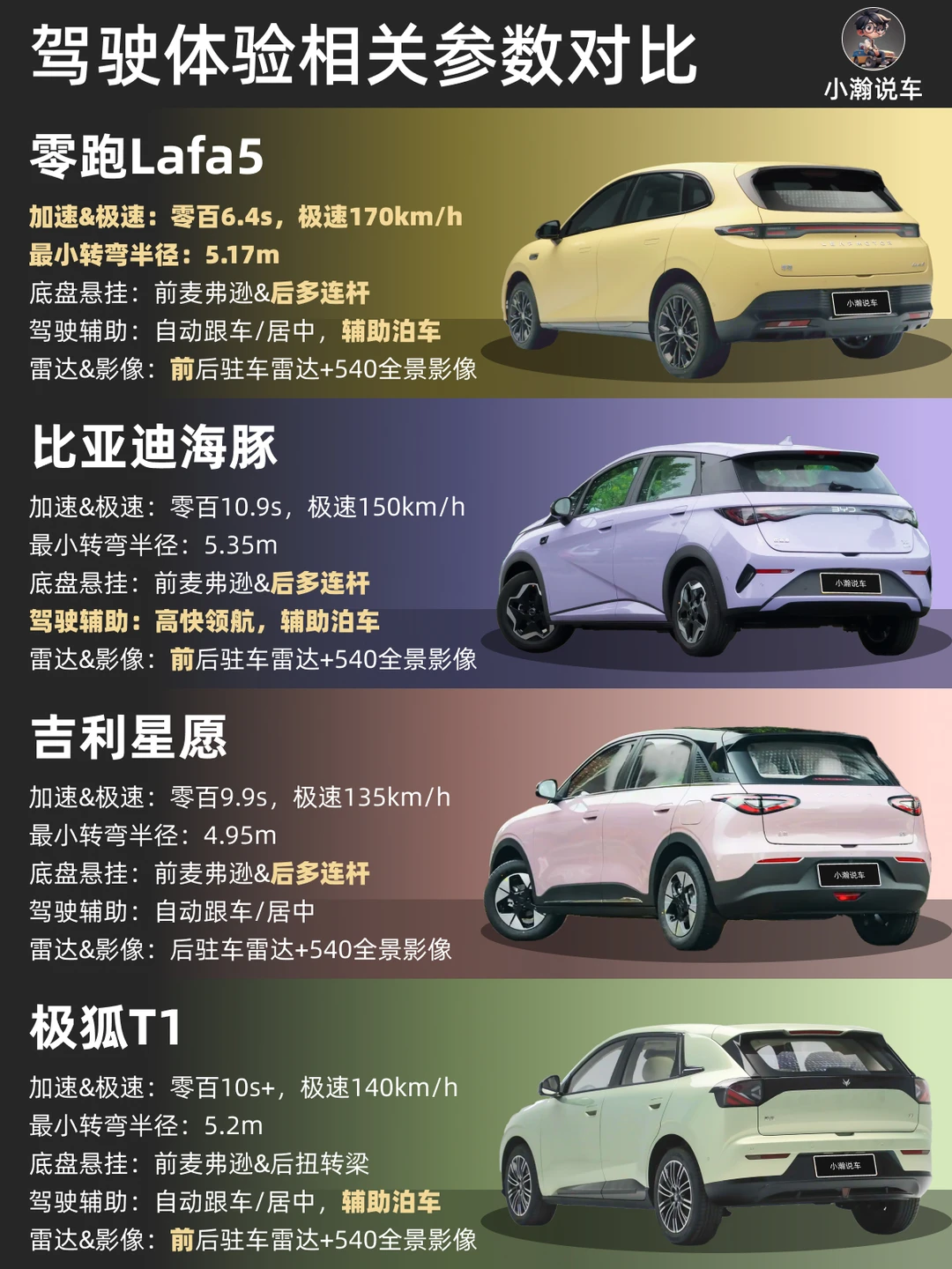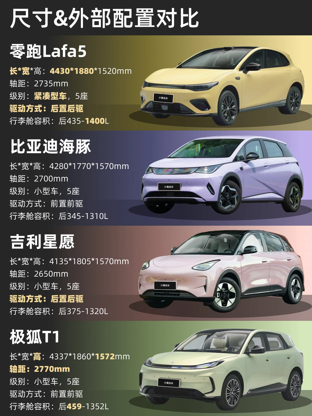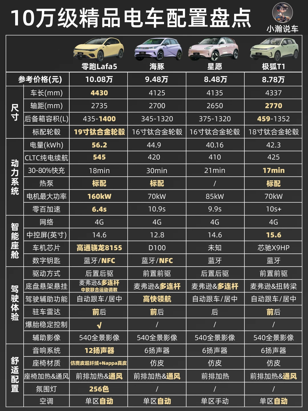 10万左右想买纯电车,都有哪些选择?今天咱们从4个维度扒一扒几台热门选手,看看哪款更适合你! 👀体格与空间: 零跑Lafa5直接玩越级,2.75m轴距配修长轿跑造型,全系标配无边框车门和19英寸轮毂把时尚高级感拉满,无论日常通勤还是带家人出行,空间都绰绰有余。海豚轴距2.7m,标准小型车尺寸,圆润设计很讨喜,16/17英寸轮毂搭配传统车门,日常空间够用。星愿是这几款里最紧凑的,2.5m轴距走可爱风格,16英寸轮毂更适合单人代步。极狐T1则走实用路线,2.67m轴距空间利用率不错,偏中庸的设计配18英寸轮毂 ,家用代步刚刚好。 🔋续航与三电: 电车续航是硬指标!零跑Lafa5 515Pro版搭载56.2度电池,CLTC续航515km,无论城市通勤还是短途跨城都有底气,还全系标配热泵,冬天续航不打折。海豚主流版本配44.9度电池、续航420km,能耗控制口碑在线,同样标配热泵。星愿续航约410km,电池容量41-45度,可惜没热泵,严寒天气续航会受影响。极狐T1续航425km,45-50度电池标配热泵,续航表现扎实稳定。 🚗性能与底盘: 零跑Lafa5运动感拉满,后驱的布局配120kW电机,零百加速6.4秒,超车不费力。前后独立悬架经欧洲团队调校,5.17米转弯半径让城市穿梭灵活,操控与行驶质感兼顾。海豚是典型的平顺代步取向,前置前驱布局,70/130kW电机可选,零百10.9秒,后扭力梁悬架侧重舒适性。星愿也是后置后驱,82kW电机零百9-10秒,动力输出平顺,底盘调校偏舒适。极狐T1前置前驱+120kW电机,零百9-10秒,调校风格偏向舒适家用。 📱座舱与配置: 零跑Lafa5内饰采用仿麂皮与Nappa真皮材料,触感高级。前排座椅通风加热、方向盘加热、电动尾门等舒适性配置一应俱全。智能座舱搭SA8155芯片,操作不卡顿。12扬声器音响+双AI语音+无麦K歌,娱乐体验拉满。海豚内饰时尚,可旋转中控屏很有特色,但座椅通风、高级音响等多是高配选装。星愿内饰活泼主打科技感,舒适性配置和智能硬件偏基础,以满足核心需求为主。极狐T1内饰兼顾实用与质感,配置均衡,但缺少高级音响、旗舰芯片等进阶配置。 💡总结与建议: “值不值”取决于你的需求权重。若你看重空间、续航、操控和配置的全面提升,并认为这些值回差价,那零跑Lafa5产品力足够扎实。若你预算敏感,海豚能耗稳、极狐T1实用、星愿小巧灵活,各有优势。建议可以带着日常用车场景去试驾,亲身去感受,才能找到最适配你的那一个出行伙伴!