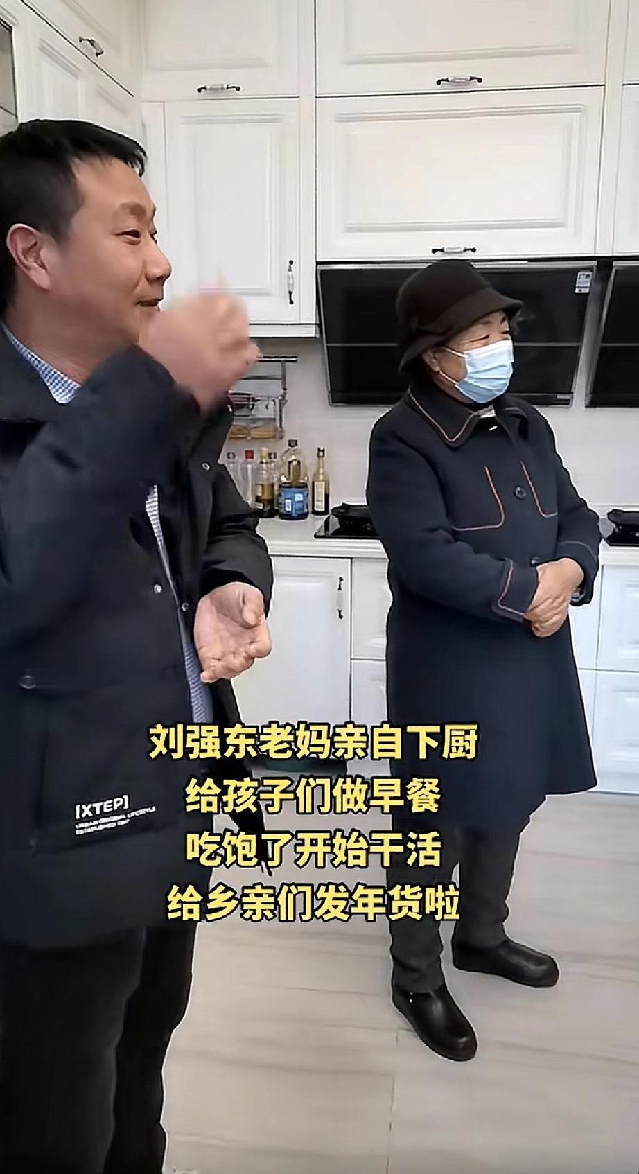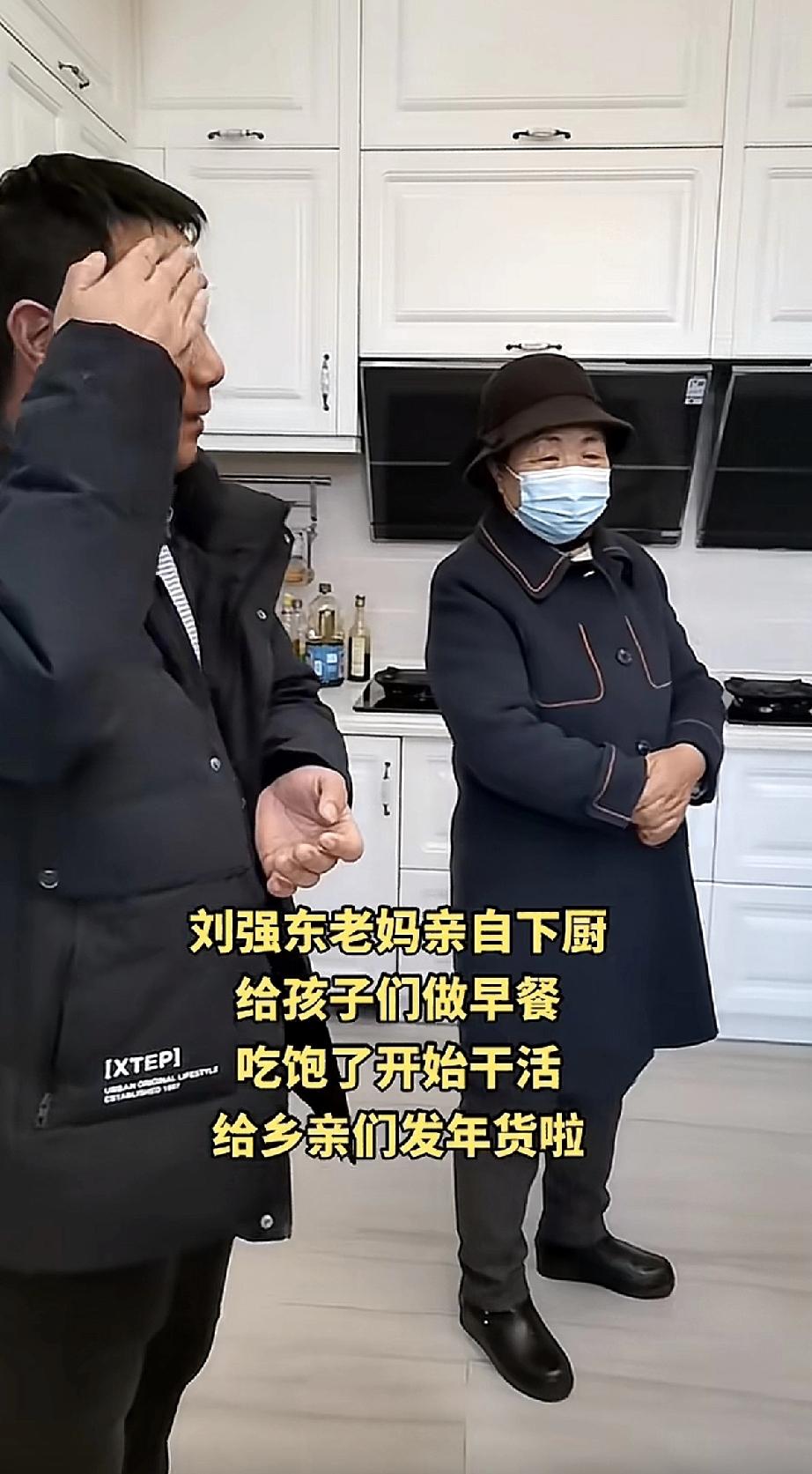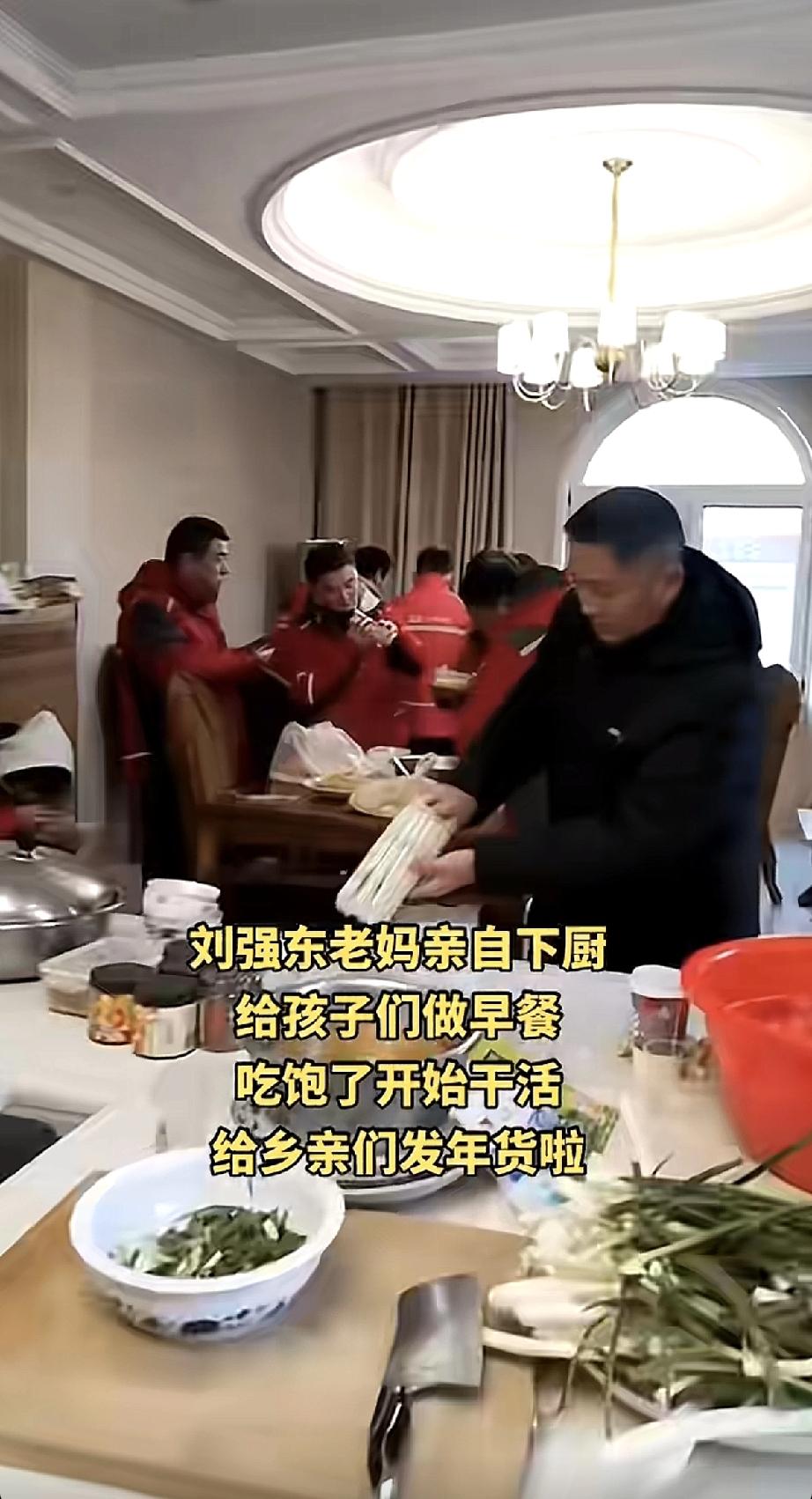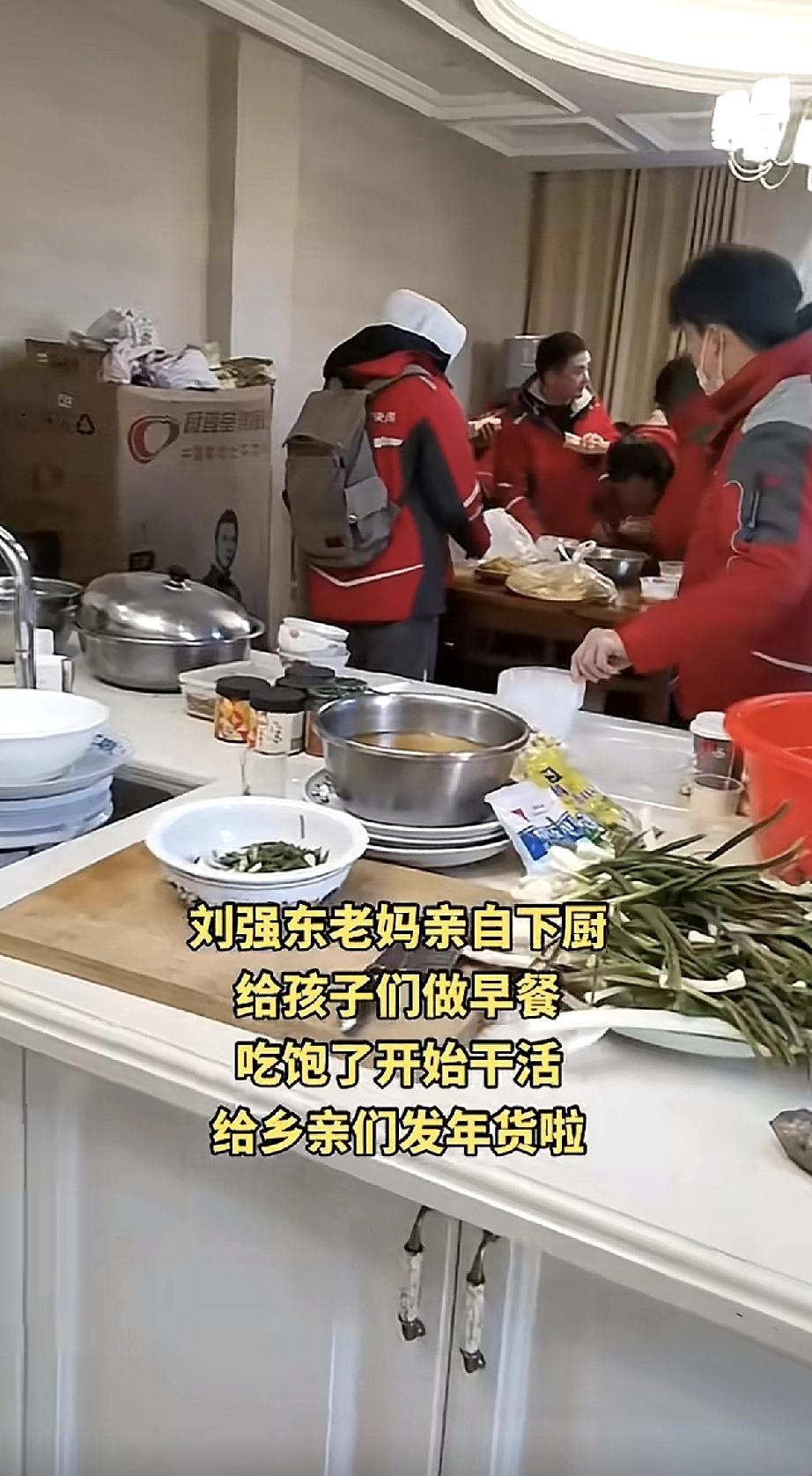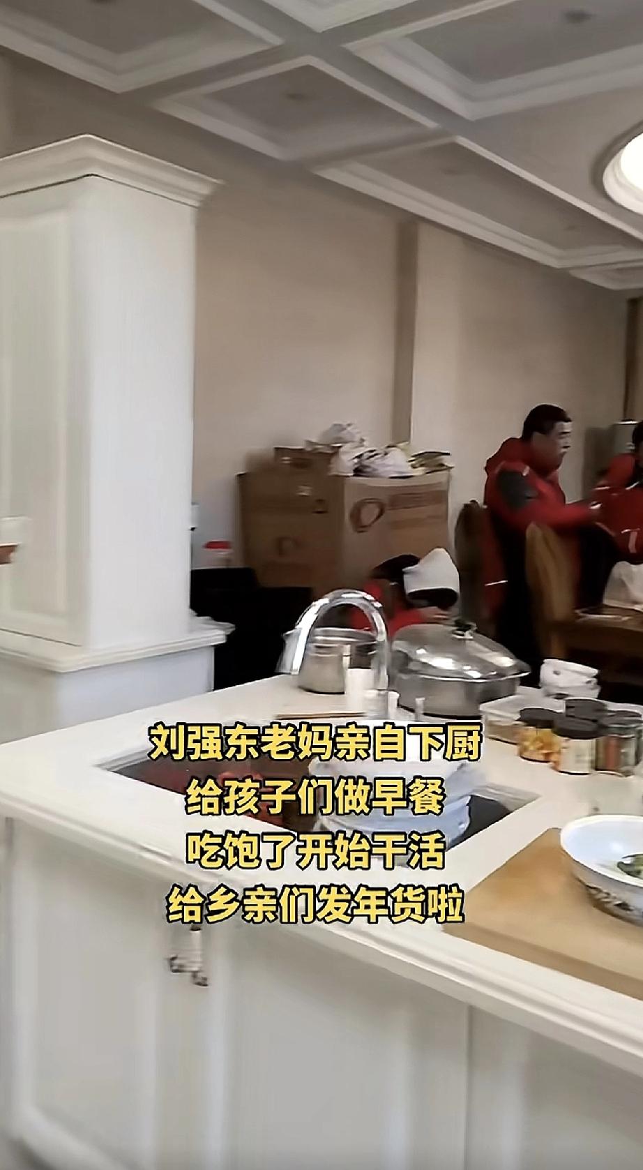 刘强东宿迁老家的别墅厨房开放,竟然比一般人家的客厅还大! 1月29日一大早,刘强东的母亲便将自家的别墅大门打开,邀请京东发放物资的员工到别墅的厨房吃早餐。 刘强东给光明村的春节物资开始发放了,来了不少京东的员工,基本都是年轻人,穿着京东的工作服,非常显眼。 他们进了刘强东家的别墅厨房,就像进了自己家一样很轻松,他们围在一个大圆桌跟前,匆匆忙忙吃饭,早餐比较简单,应该是饼之类的。 刘强东的母亲则站在一旁,和两个年轻人聊天,一边聊天一边看对面吃饭的那些京东员工。 同时,刘强东家别墅的厨房曝光,装修特别豪华,一看就是别墅的厨房,而不是一般商住楼的厨房,因为面积太大了,光是切菜的地方都有一个很长的板,感觉比普通人家的客厅面积还大。 在厨房的洗菜板上能看到韭菜、案板、切菜刀之类的,看来刘强东的母亲准备中午给京东员工包饺子吃。 刘强东的母亲虽然76岁了,但身体还可以,她现在在京东食堂打工,就是卖饺子,因此她包饺子很好吃。 前一天下午就看到刘强东母亲坐着货车回来了,带了很多桌子,还有韭菜,没想到一大早就起来准备包饺子了,真勤快。 总之,看了刘强东老家别墅的厨房那么豪华就知道了,刘强东对父母也是很好的!