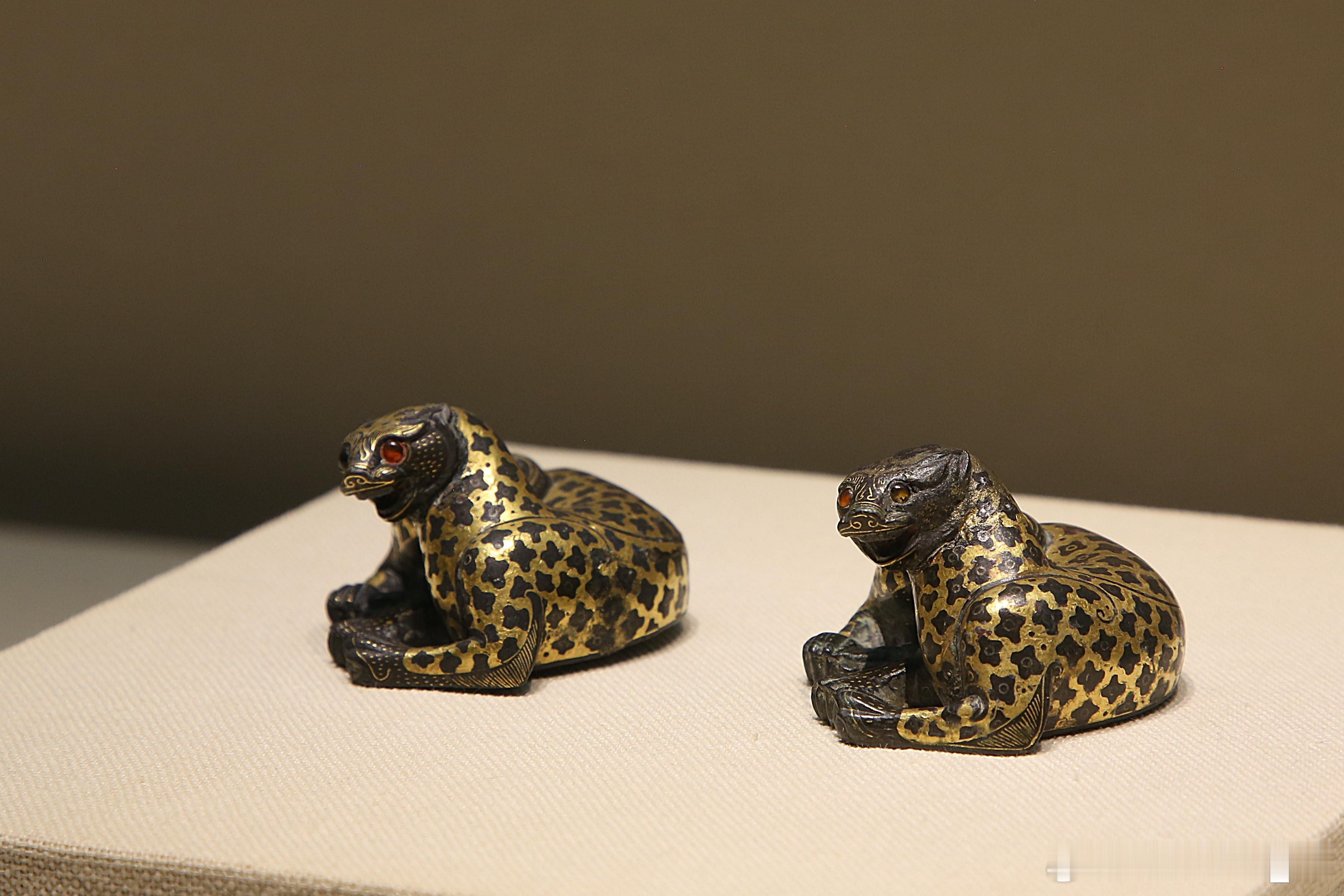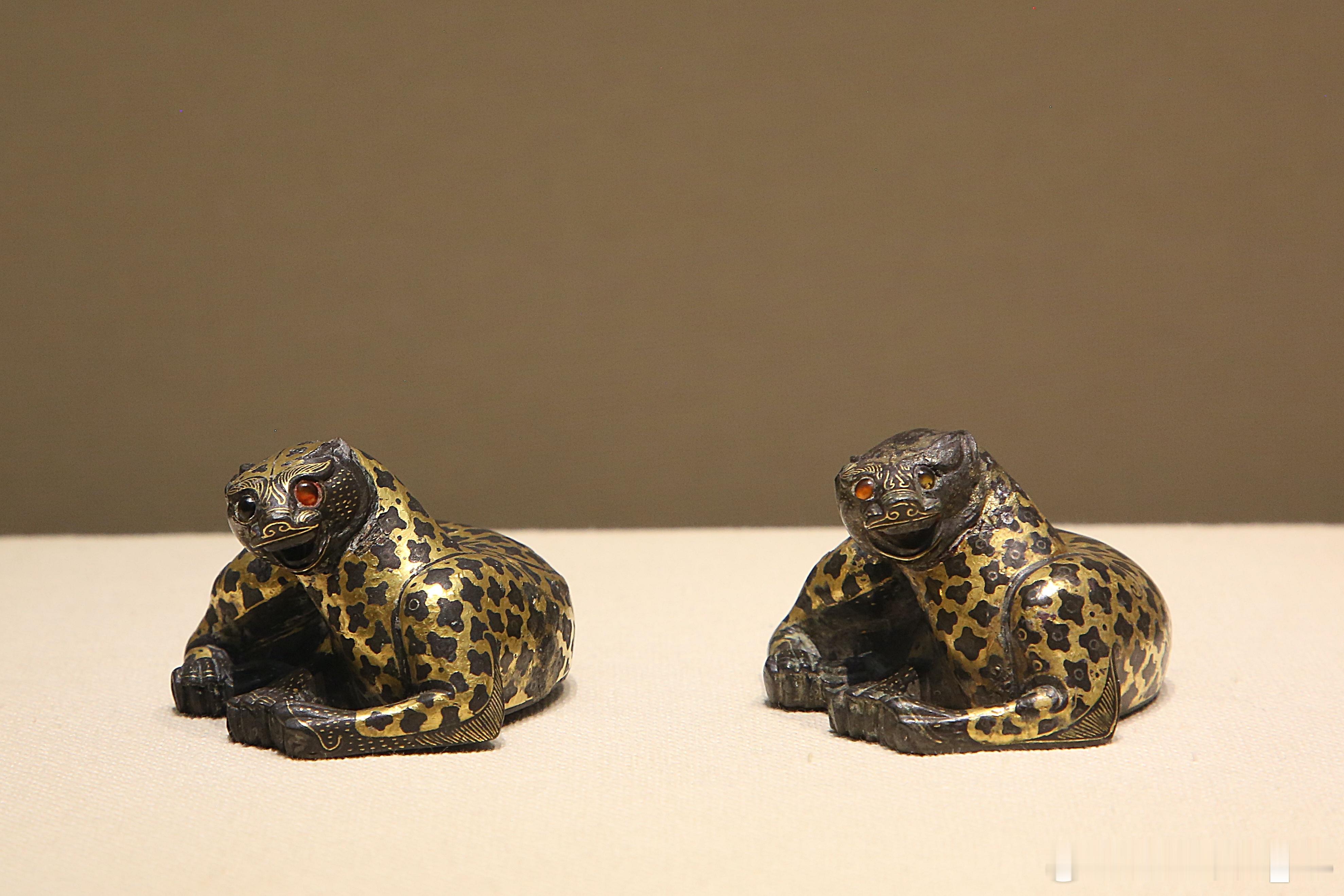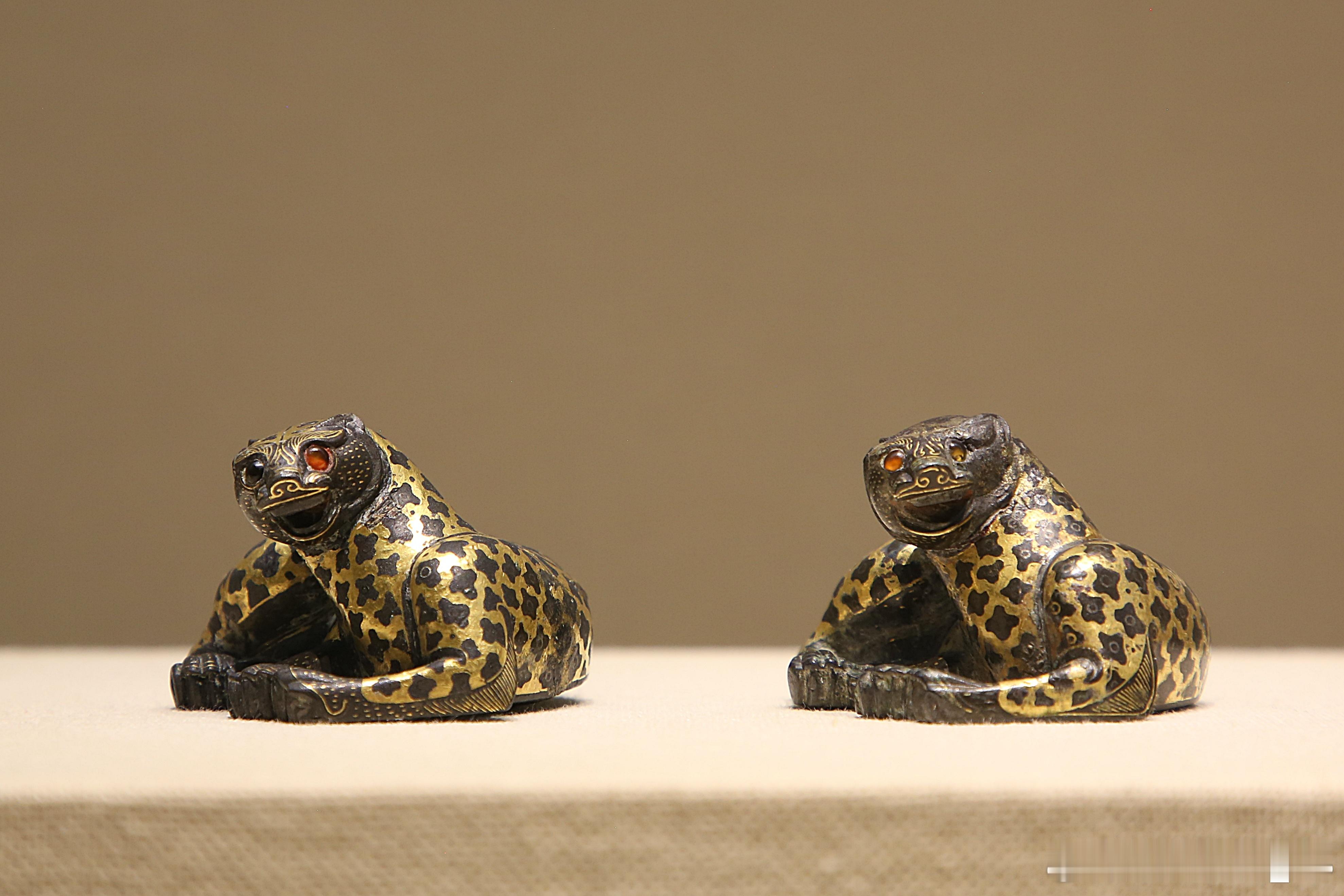 错金银铜豹西汉(公元前202年-公元8年)河北博物院藏1968 年出土于河北保定满城西汉中山靖王刘胜之妻窦绾墓。它们最初是 “席镇”,用来压住席子的四角防止卷翘,后来也被用作镇纸镇书。铜豹长 5.9 厘米,高 3.5 厘米。铜豹作蜷卧状。昂首张口,长尾弯卷,平底。豹身以金斑为主纹,错出梅花状豹斑,头足和尾部錾点状纹,口部涂朱。双眼镶嵌白玛瑙,因为粘合剂里含有朱红色颜料,所以现在看起来是红色的。豹体内灌铅,使其更加稳重。装饰华丽,造型生动优美,是难得的汉代艺术珍品。约会博物馆文物