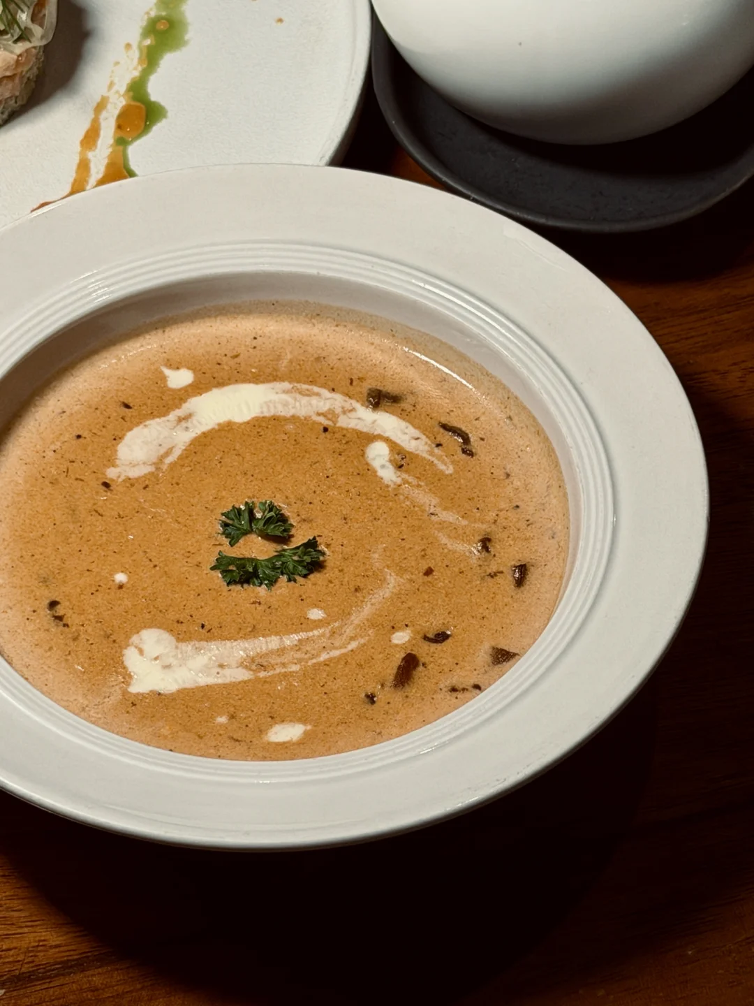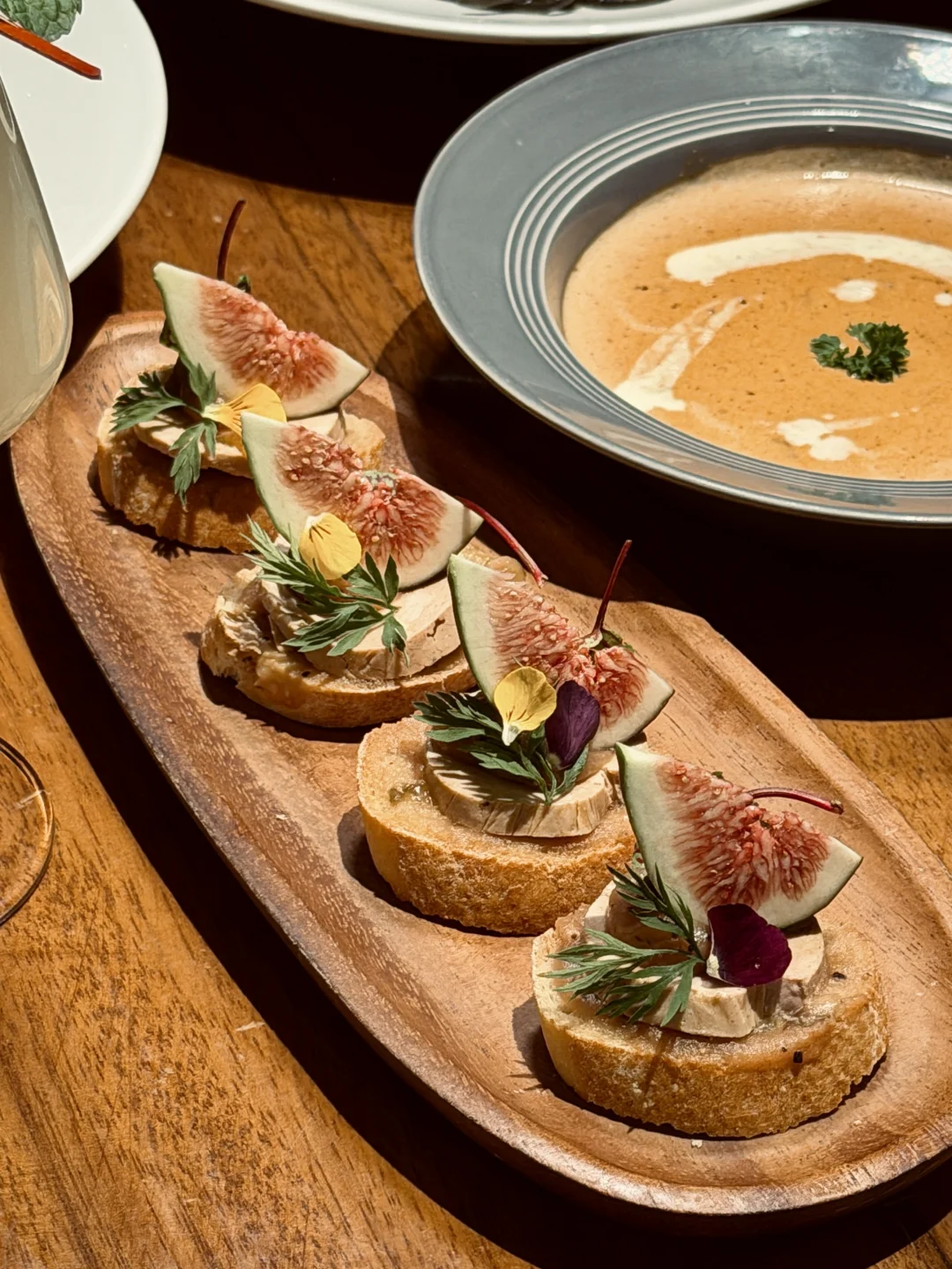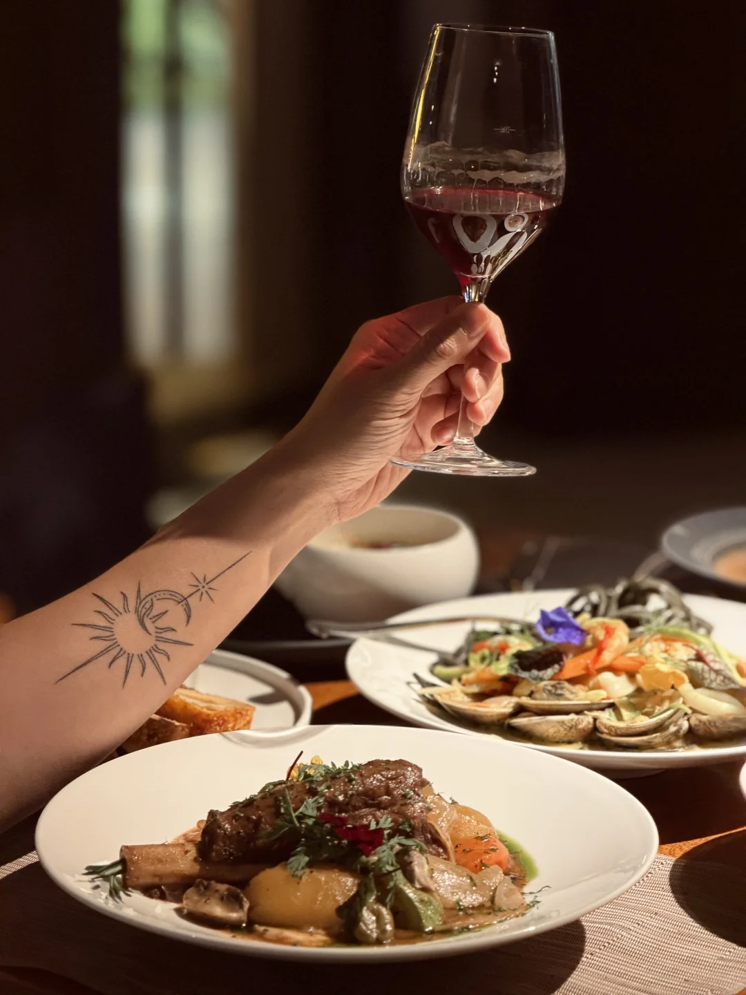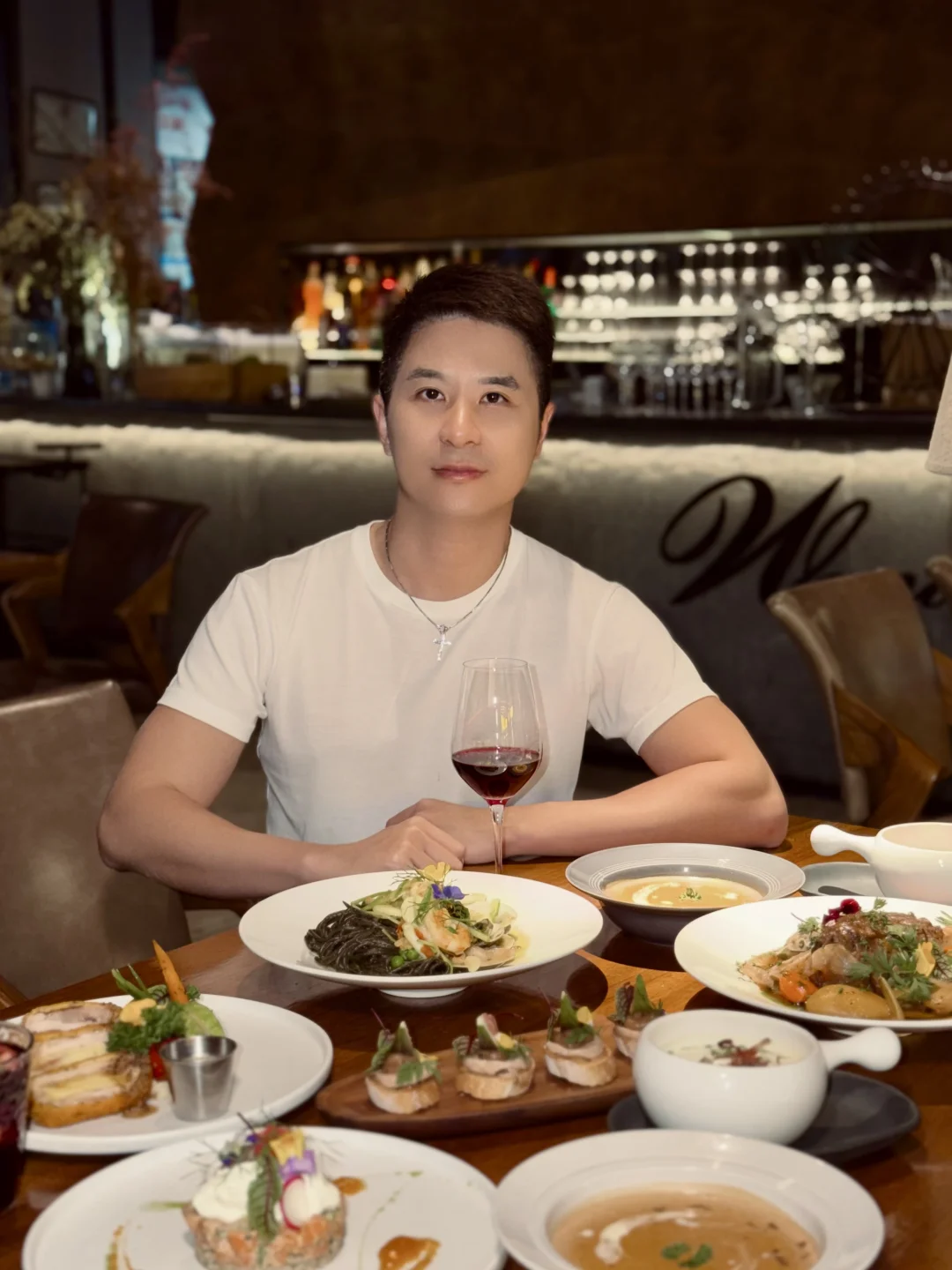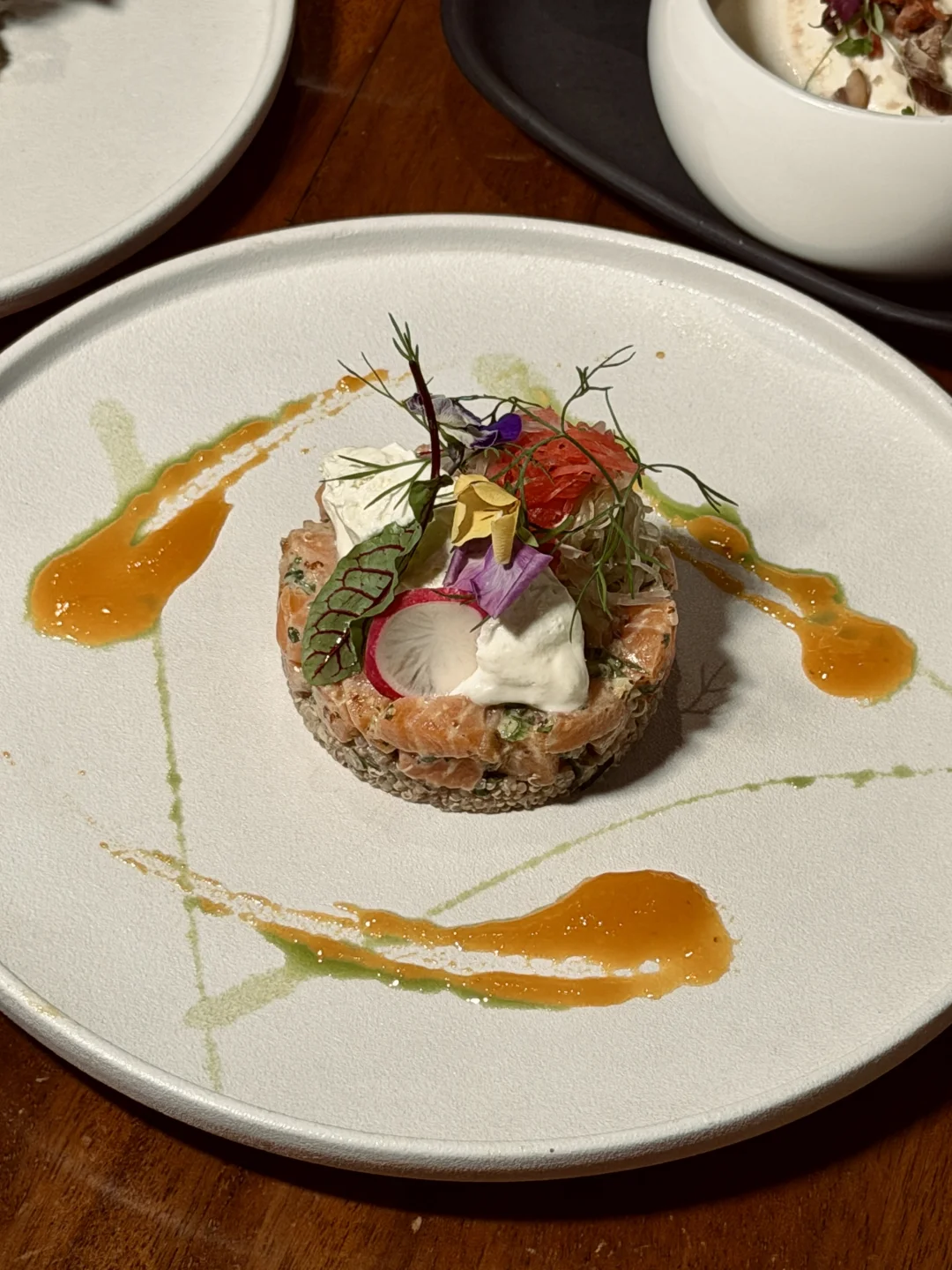 又又又来了,在春节前再吃一次法国米其林三星常驻主厨的法餐~ 这次点了些餐厅经典法餐,每一道味道都很赞~有几道印象很深: · 挪威风味三文鱼塔 · 无花果苹果低温鹅肝冻 · 填陷鸡腿卷 🌙 氛围是它的第二道招牌 光线设计得恰好,不明不暗,像给空间蒙上一层柔光镜。适合约会时的耳语,也容得下老友的畅谈。整个餐厅细节里都是慵懒又考究的法式情调。 ✨ 食后小记 味觉与心境皆饱足。所谓“高级”,从不是疏离的昂贵,而是用匠心打磨每道菜,用氛围温暖每颗心。