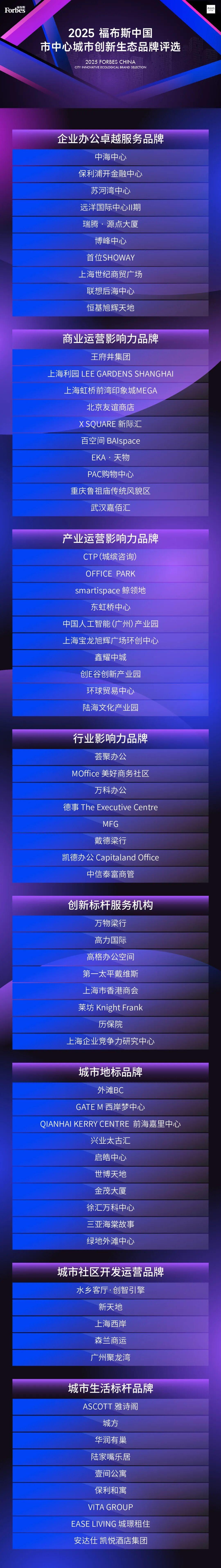 以下为“2025福布斯中国·市中心城市创新生态品牌评选”最终结果: