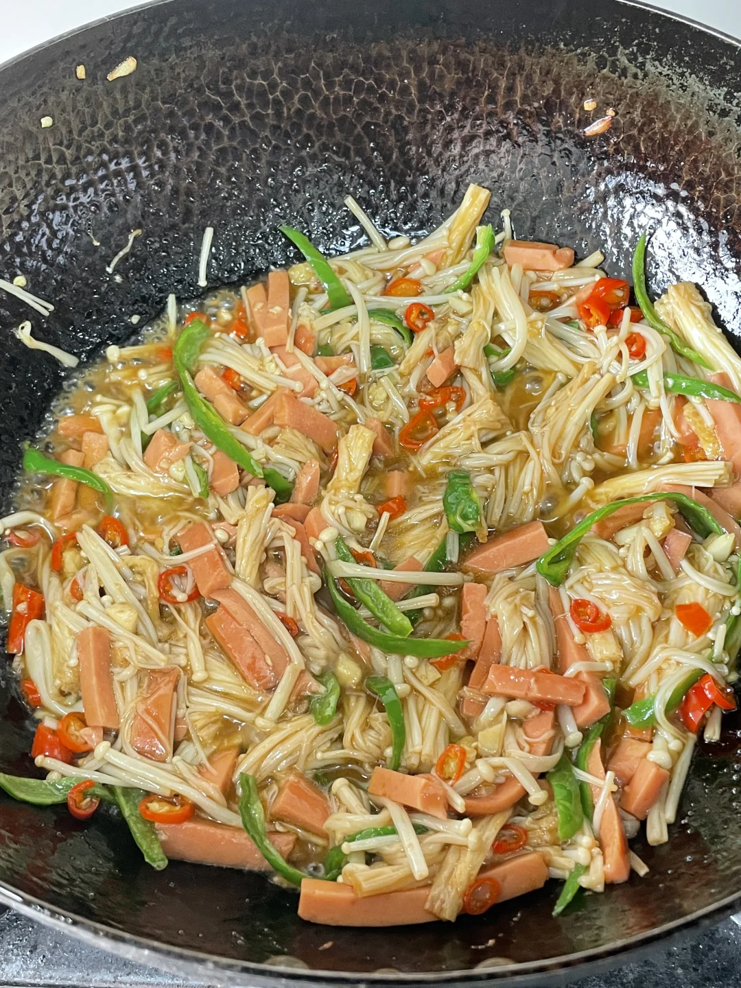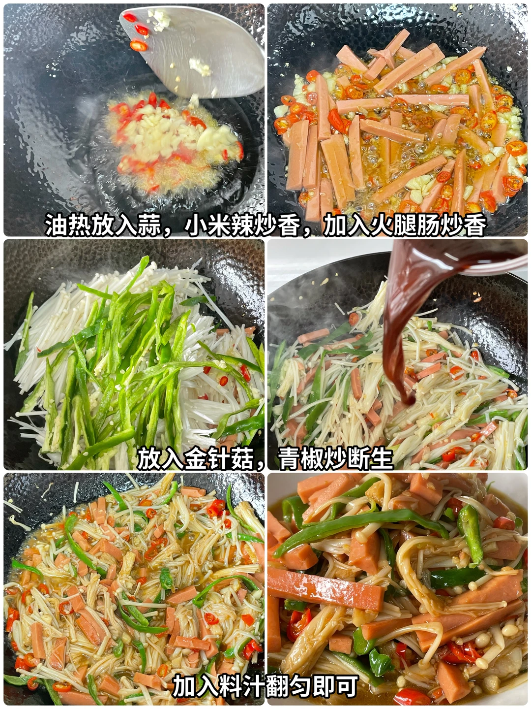 姐妹们,今天给大家出一个巨好吃的简单家常下饭菜,做法也简单,但真的巨下饭喜欢的姐妹可以尝试做一下。 🌶️食材:金针菇,火腿肠,青椒 👩🍳做法: 1⃣️火腿肠切粗丝。金针菇一分为二,青椒切粗丝,火腿肠切粗条,再准备一些小米辣和蒜。 2⃣️调一个料汁,一勺生抽,1/4勺老抽,1/4勺蚝油,适量的盐,鸡精。1/4勺的淀粉。然后放入3勺的清水。 3⃣️起锅烧油,油热将蒜和小米辣炒香,加入火腿肠炒香,再放入金针菇和青椒炒断生,加入料汁翻匀即可出锅。喜欢的姐妹去试试吧。
