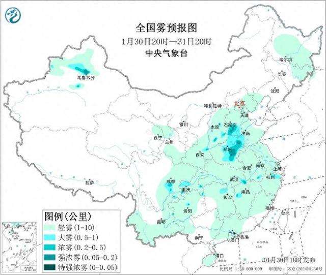 此外,30日夜间至31日上午,河北南部、河南中东部、山西南部、山东西部等地有大雾天气,局地有能见度低于200米的强浓雾。