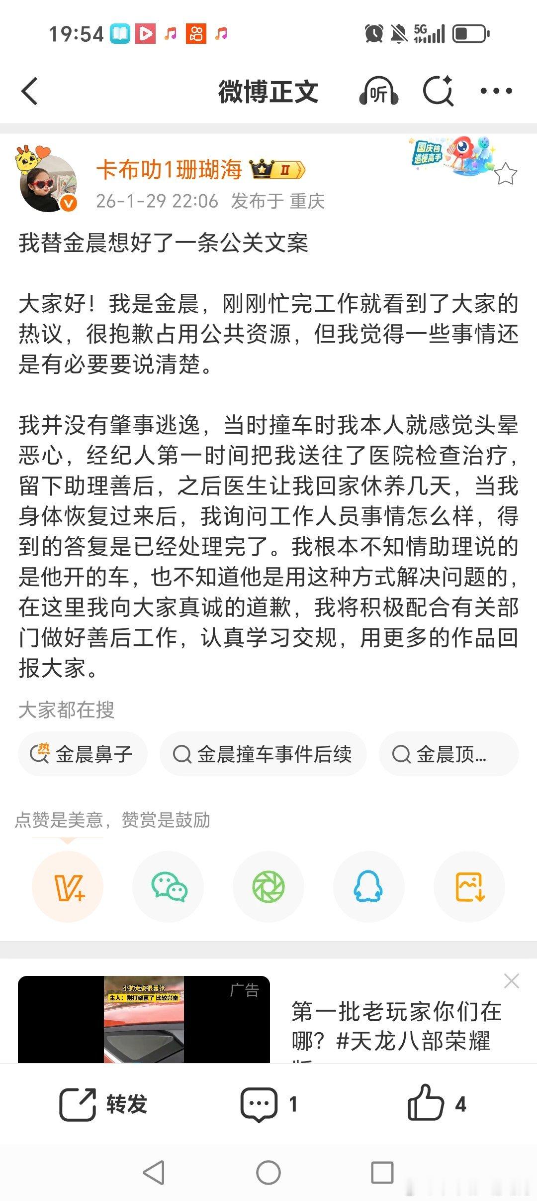 金晨的警情通报和我替金晨想的公关文案大同小异