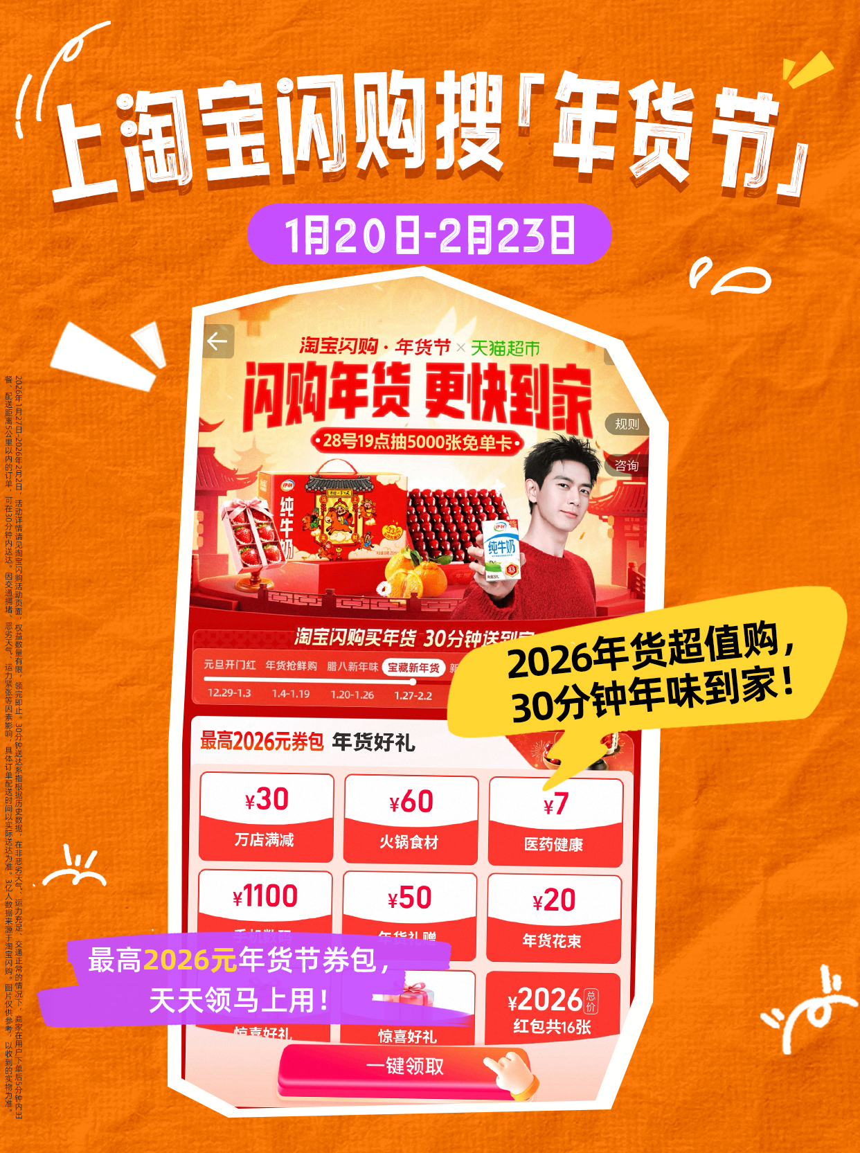 写春联时墨汁泼了一桌,红纸全毁……瞬间崩溃!还好有上淘宝闪购买年货转眼就到,30分钟新红纸、金粉墨全送到!重写一副更大气,今年门面稳了~现在上淘宝闪购搜「年货节」,30分钟年味速速到家,还有2026年货超值购!淘宝闪购年货节