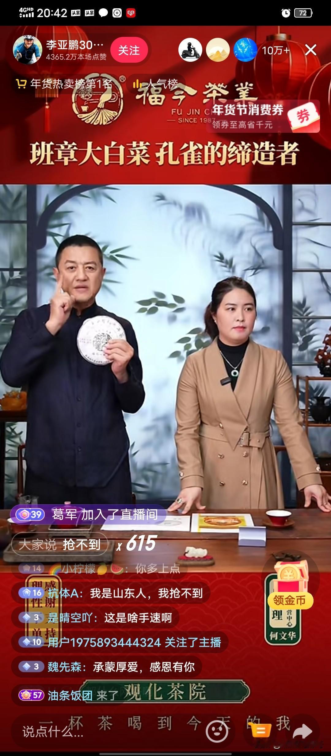有没有跟我一样只要刷到李亚鹏在直播就会点进去, 不是为了买他的东西,主要是看直播间有多少人。 看他的直播间有10万+,心里一下子就安心了。 今天晚上我同样刷到李亚鹏在直播,点进去一看,哈哈,又是10万+ 在线。 李亚鹏今天晚上卖的是茶叶 , 满屏飘的不是“抢不上”,就是“不上10万单没意义, 因为总是抢不到”;“你们下单是坐火箭吗, 手速那么快”! 好人有好报,看来李亚鹏真的要翻身了。 李亚鹏翻了身,唇腭裂儿童们就更有福啦。 真希望李亚鹏的直播间永远这么火下去。