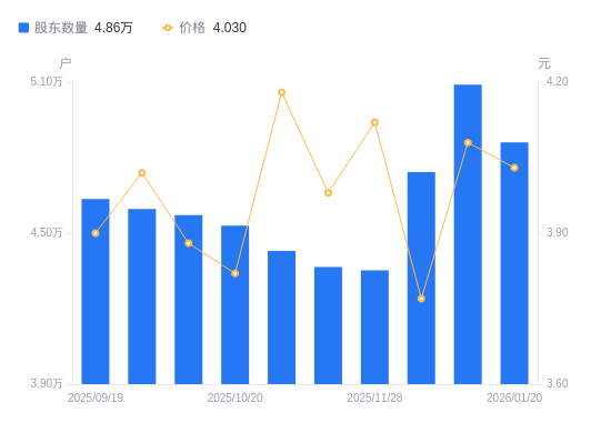 日期A股户数(户)流通A股户均持股数(股)户均持股市值(万元)2026-01-204860719669.207.932026-01-095090118782.757.662025-12-194742520159.437.602025-11-284352621965.289.052025-11-204365521900.388.722025-11-104429821582.489.022025-10-204529321108.368.062025-10-104571820912.138.112025-09-304596120801.578.362025-09-194636220621.658.04