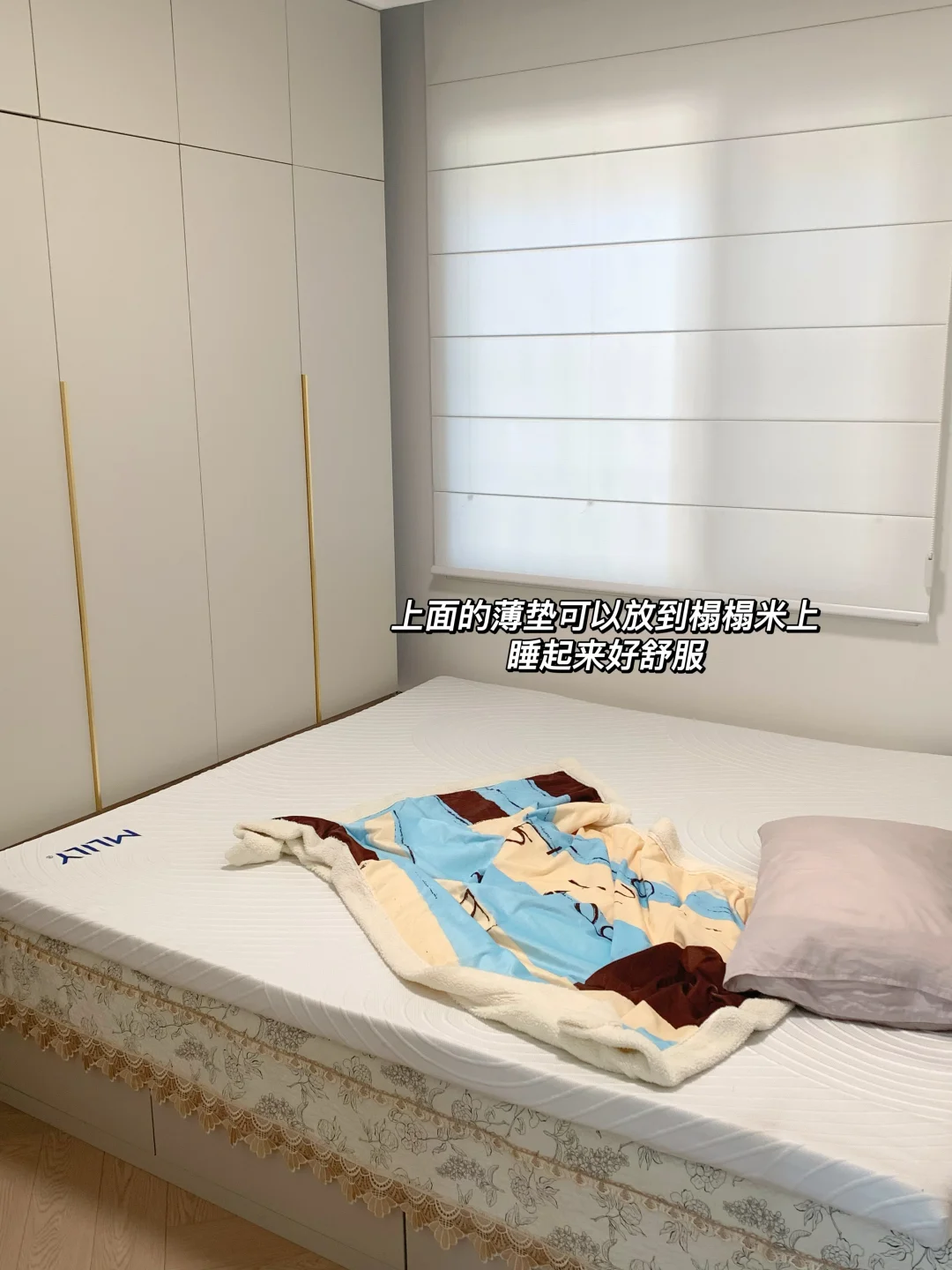 我朋友带娃来玩,家里榻榻米有些硬,刚好我在晒被子,就想着把床垫上层薄垫铺到榻榻米上,真得舒服!就是娃不小心把果汁🍹洒上了渗进去了,当时以为要留印子了,赶紧拆开外套先局部手搓,再放洗衣机洗的,干了和新的一样。这点让我觉得可拆洗真的挺重要且方便的。