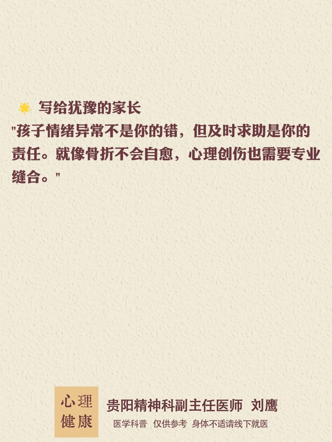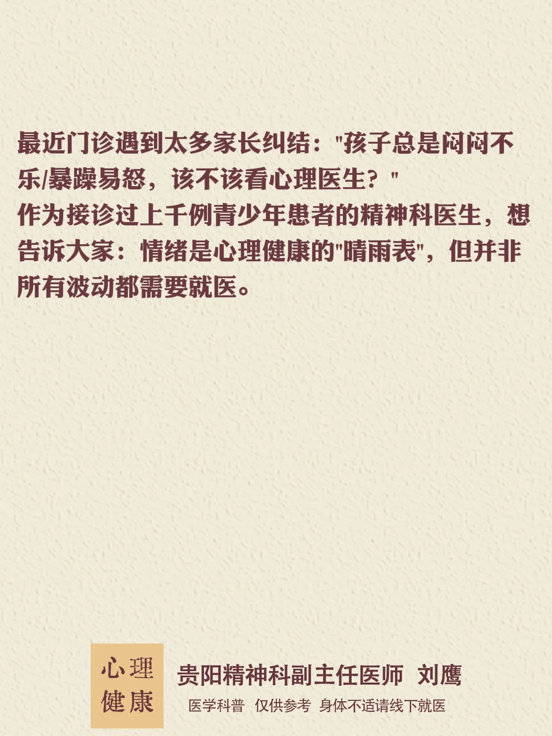 贵州的朋友们,大家好,我是贵阳精神科医生刘鹰。了解更多心理学知识,可移至主页。