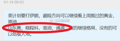 1.14日 【四方股份】 16日涨6%,19日强势上板1.14日 【特变电工】 16日涨7%,19日强势上板1.14日 【天奇股份】 15日涨4%,19日涨7%1.14日 【晓程科技】 19日涨6个点,21日涨6%,23日涨7%,26日20CM上板,27日涨14%,28日20CM上板,29日涨18%1.14日 【山东黄金】21日涨4%,23日涨5%,26日上板,27日涨2%,28日涨9%,29日涨9%1.14日 【通源石油】 26日涨16%,27日涨7%,28日20CM上板,29日20CM上板,30日涨8%1.14日 【准油股份】 26日涨9%,28日强势上板,29日上板,30日强势上板