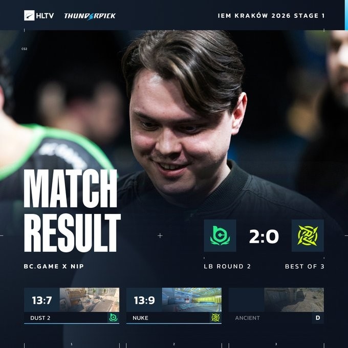 最终BC继续外场控制冲A,s1mple双杀起步,BC以13-9拿下图二,两图横扫NIP,晋级Stage2!