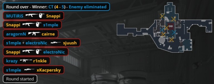 第11回合电子哥call战术,外场电子哥前顶T家击杀cairne,s1mple大狙铁板双杀,电子哥回防B点打掉snappi,残局森森电电对阵下包的sjuush,森森电电进管道来B,juush手雷炸飞拆包的电子哥,随后点掉s1mple,sjuush单局三杀,NIP拿到第5分。