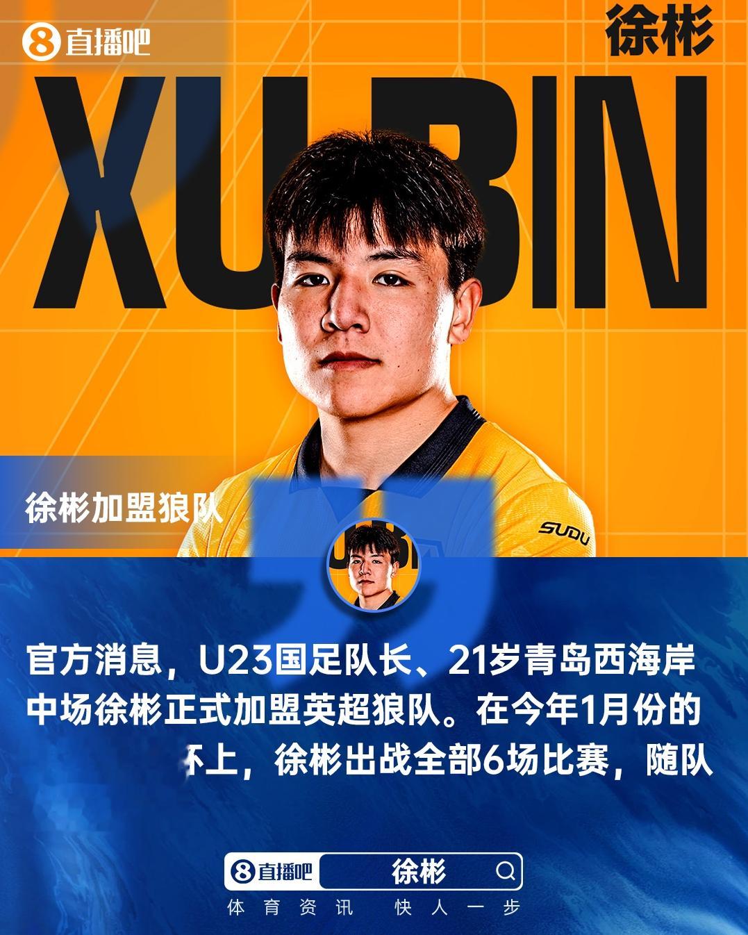英超球队狼队官方消息,U23国足队长、21岁青岛西海岸中场徐彬自由身转会加盟,球员并将在本赛季剩余时间在英格兰国内联赛完成租借!据直播吧后续消息,徐彬将租借加盟英甲球队巴恩斯利。