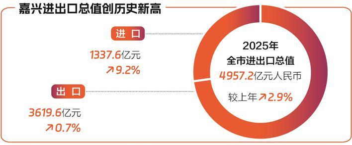 嘉兴海关最新数据显示,2025年全市实现进出口总值4957.2亿元,同比增长2.9%。至此,嘉兴进出口总值已连续十年保持正增长,在复杂多变的全球经贸环境中,彰显出强劲的韧性与活力。