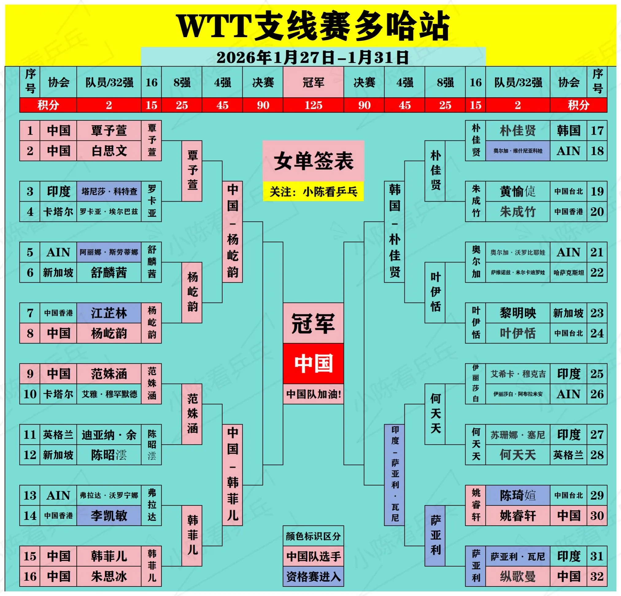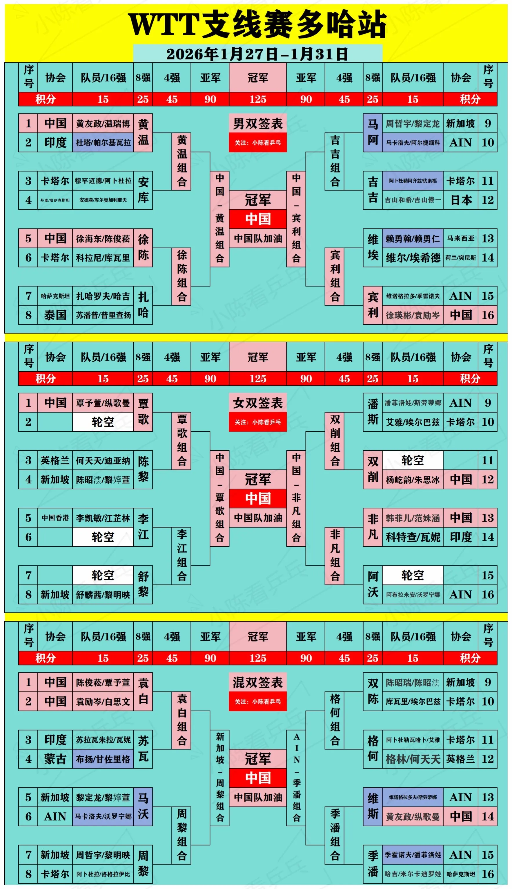 WTT多哈支线赛1月30日赛后签位图更新。WTT多哈支线赛1月30日赛...