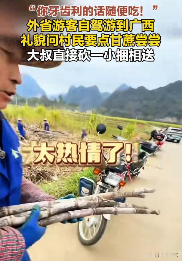 广西,好客的乡亲们就是大气!一男子开车自驾游来到广西境内,看到当地村民在收割甘蔗,男子表示,想要尝一口,因为看着好诱人啊!没想到,话音刚落,收割甘蔗的村民大哥,直接就绑了一捆甘蔗送过来,直接放在男子的车上,甚至大手一挥:只要你牙齿利落,随便吃,不要你的钱! 广西新闻网1月29日报道了这则新闻。 据报道称,看到乡亲将甘蔗送到自己车里,男子非常激动,一直说要给钱,没成想,人家村民很大气,一分钱都不收。这就是好客广西,村民们太热情啦! 又到了收甘蔗的季节,一男子喜欢全国自驾游,这次,来到了广西,没想到,亲眼目睹了收割甘蔗的盛况。 就看到村民们都在忙于收割甘蔗,一个个都忙的不亦乐乎。看到这个丰收的场景,估计村民们劳动起来也很有劲吧。 而男子则从未见过收割甘蔗的场面,立刻就将车子停下来,靠在路边,慢慢观赏眼前的场景。 看到有游客驻足,一位村民大哥也停下了手里的农忙,来跟男子打招呼:“小伙子,你是过来旅游的啊!” 男子连连点头,表示自己也是第一次见到如此庞大的丰收场景,没想到,甘蔗是长在这边的,太壮观了! 甚至,男子还开玩笑的说:“哈哈,这些甘蔗长得可真好啊!要是能吃上一口,尝一下就好了!” 没想到,男子本来就是随意一说,村民大哥直接就往回走,走到甘蔗地里,三下五除二就包扎了一捆甘蔗,直接扛过来。 村民大哥气喘吁吁的来到男子车旁,示意男子打开车门,非常豪爽的就把一捆甘蔗给送给了男子。 “哎呀,大哥,谢谢你,我不需要这么多的!”男子看到村民非常热情,一时间竟然不知道该说什么了。 没想到,村民大哥仍然执意要相送,并且还细心的帮助男子,将甘蔗都一对半的掰开,回头还交代男子:“只要你的牙口好,这个甘蔗你可以随便吃,水分特别足,可好吃了!” 旅游的男子立刻表示要付钱,谁知道,村民大哥大手一挥,怎么也不肯男子付钱。 之后又帮助男子将车门又关好,大气的说:“付什么钱啊,送给你,给你尝个鲜。欢迎你下次带着朋友再来我们广西玩!” 然后,又继续返回了收割甘蔗的大部队中,继续开始忙活了。 男子非常激动,一直大声的感谢这位村民大哥,表示内心的感激之情。男子感觉,还是劳动人民淳朴啊,他们有一颗热心、善良的心灵。 就跟这边四处的美景一样,好的山水、好的风景,这才养育了淳朴的乡亲们。或许,这才是旅行的意义吧。 男子带着感恩与开心,继续开车上路,继续开始自己的旅行。同时他也把视频发布到网上,分享自己的旅游经历。 1.村民豪气的赠送男子甘蔗,男子可以不付钱吗? 根据《民典法》第六百五十七条规定,赠与合同是将自己的财物无偿赠送给受赠人,而受赠人也接受,这样双方达成一致,就不要面临法律追责。 本案中的村民,自己也明确的表示:不需要钱白送。这就非常明确的说明了本意,拒绝付钱,主动赠送,而男子也表示了感激,接受了甘蔗。准备付钱,但是被村民拒绝,双方就构成了赠与关系。 因此,男子也就可以不用再付钱,没有付款义务,付钱就属于自愿的行为了,并非是法律责任。这就是所谓的“人情”。 2.外出旅游时,即便看到非常浩荡的甘蔗地,男子如果不问自取,这个行为是否可行呢? 根据《治安管理处罚法》第四十九条规定,盗窃公私财物的,或者哄抢财物,此举构成违法,会被处以行政拘留或者罚款。 虽然一根甘蔗的价格不高,但是这个行为已经触犯了法规,如果有监控记录查实,行为人的做法侵犯了他人财产权,可能需要面临刑事追责。 旅游经过人家的领地,就需要尊重他人的劳动果实。可能看到的是浩荡的甘蔗地,但是这是劳动人民的辛勤果实,甚至是他们半年来的收入来源。 再人情的风土人情,也需要尊重边界感哦,这才是真正的善意。或者可以彼此分享、互相赠予,更加能够让人情长久。 对此,大家都怎么看呢,不妨评论区里留言,一起来讨论吧!