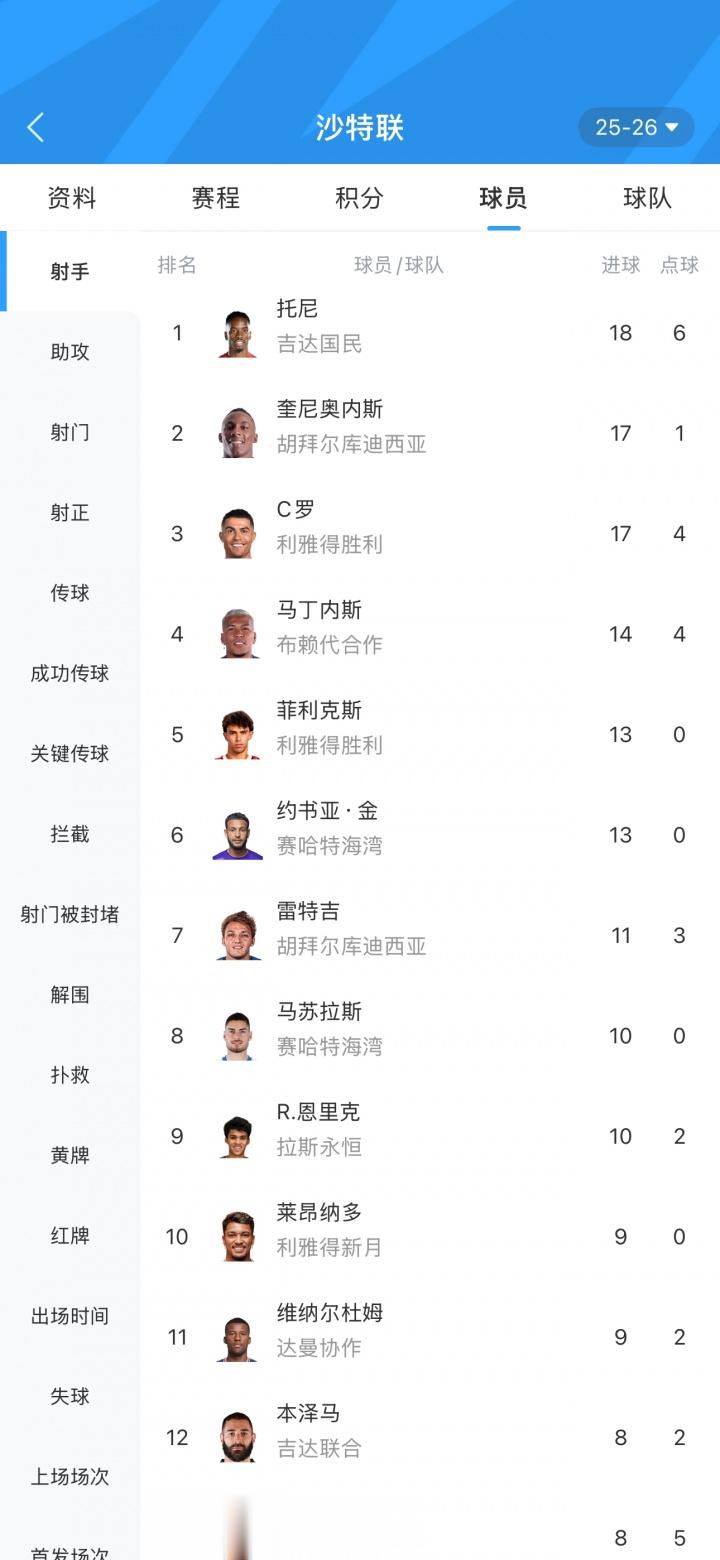 直播吧01月31日讯本赛季沙特联第19轮战罢,目前的射手榜上,伊万·托尼18球居首,奎尼奥内斯和C罗以17球并列第二。