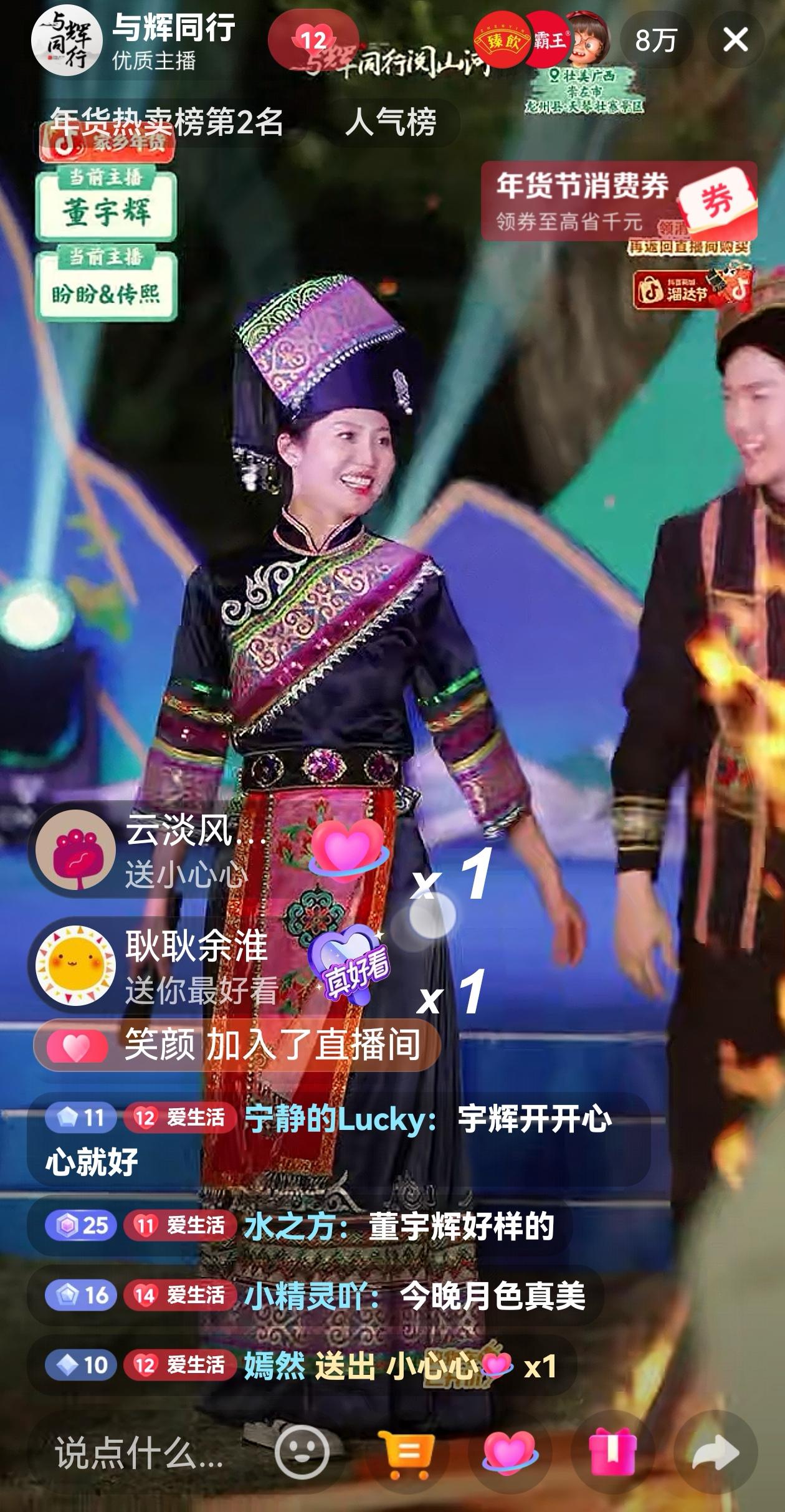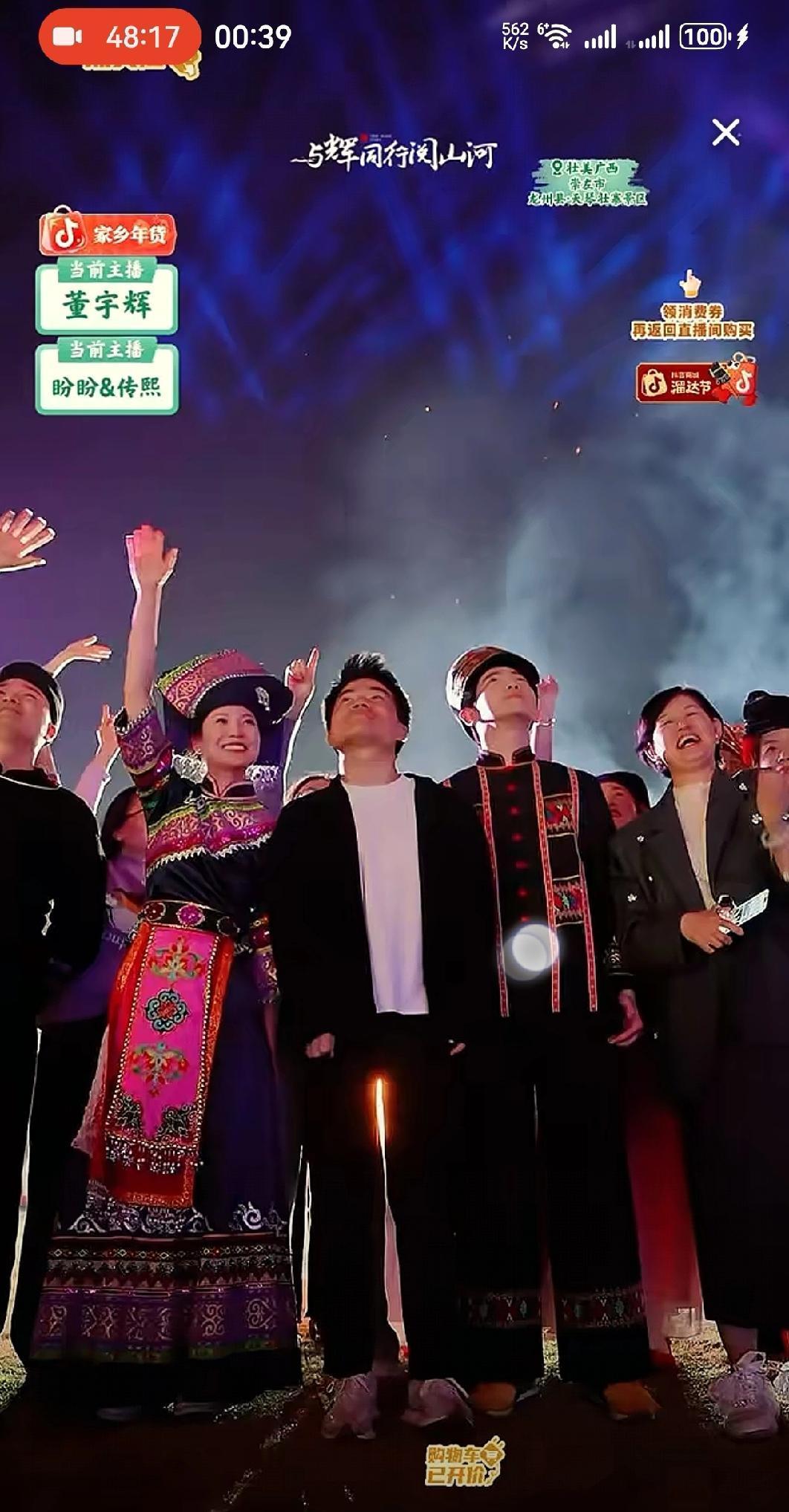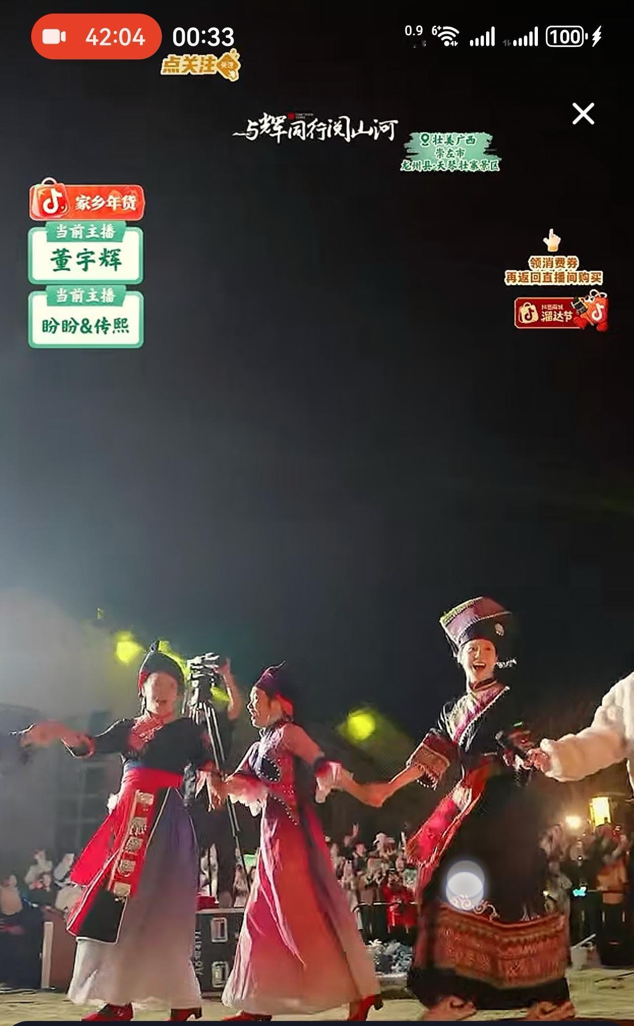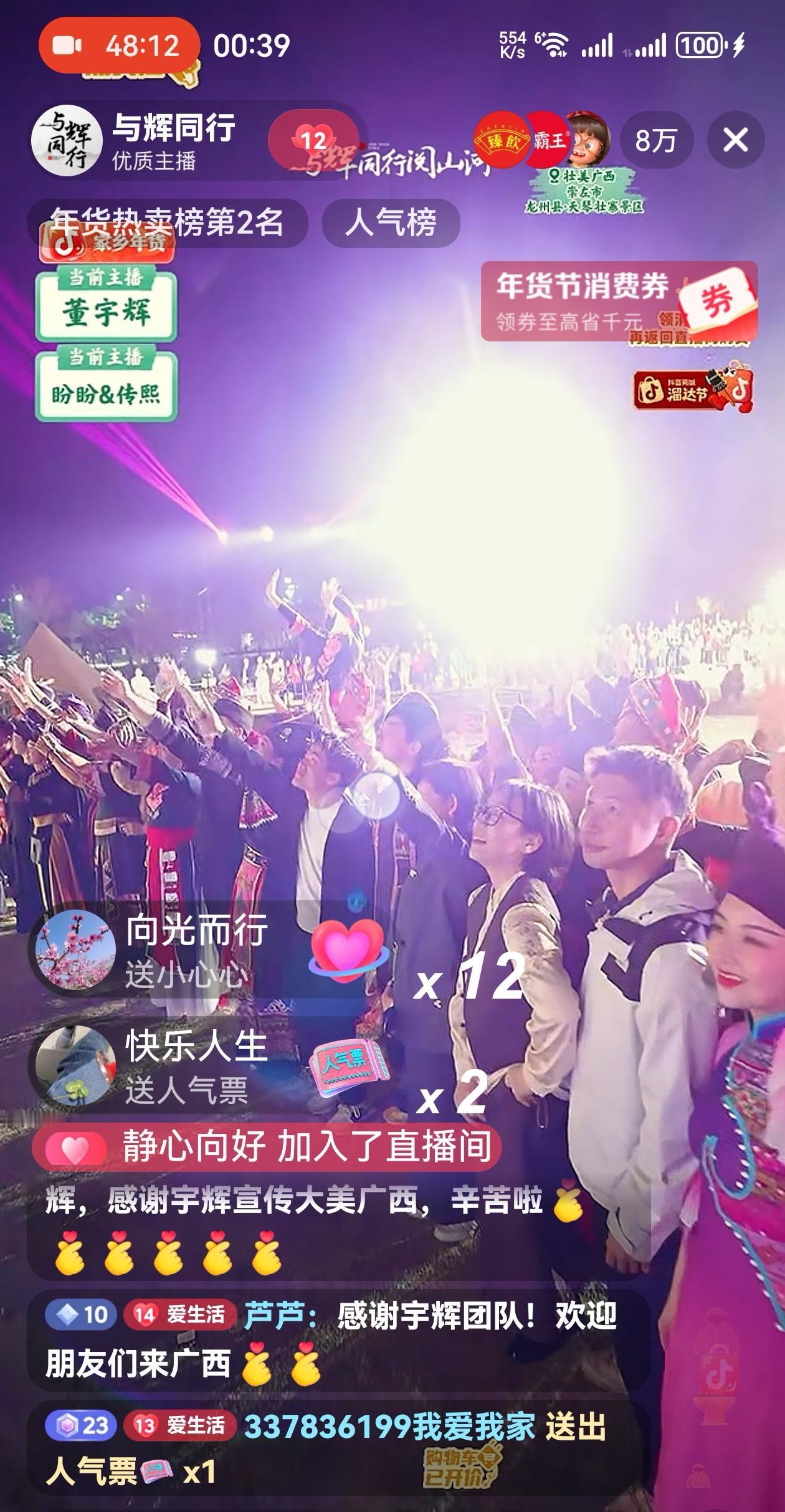 与辉同行阅山河广西行告别之夜,董宇辉和广西人民共创了一个歌舞欢腾浪漫之夜。 能歌善舞的壮族儿女,把最后的告别仪式整得热烈又接地气,董宇辉一边唱着山歌好比春江水,哪怕滩多浪又急,一边挽着手,跳着欢快的民族舞蹈,比起2023年桂林的跨年之旅,他离大家更近,更放松。看他在涠洲岛被太阳晒伤的脸,显然就是玩嗨了的样子。 有幸在2023年与董宇辉合影,这一次他再次来到我们的家乡,那是我们第1次追星,也曾留下这样难忘的相片,从来没有明星被要求和这样一大群人合影吧,大家愿和他同框,留住这难忘的时刻。 盼盼的少数民族着装总是那么出彩,她又像在云南行结束时那样狂舞,这种场合最适合她,好多次结束的时候,都是她站在宇辉旁仰望星空,观看烟花,志同道合的人,互为一生中的贵人。此次广西行最大的遗憾是没去看看她的真容,如此温婉大气的女子,可遇不可求。