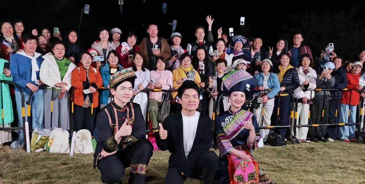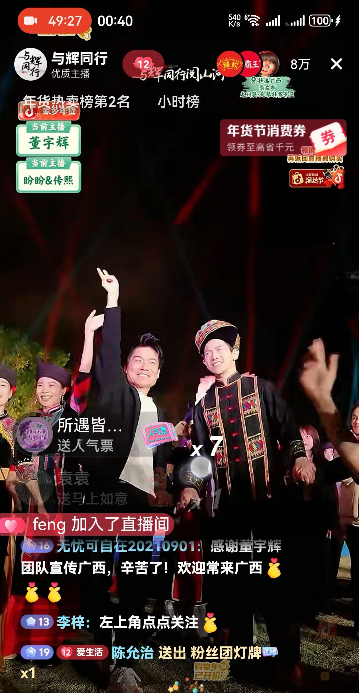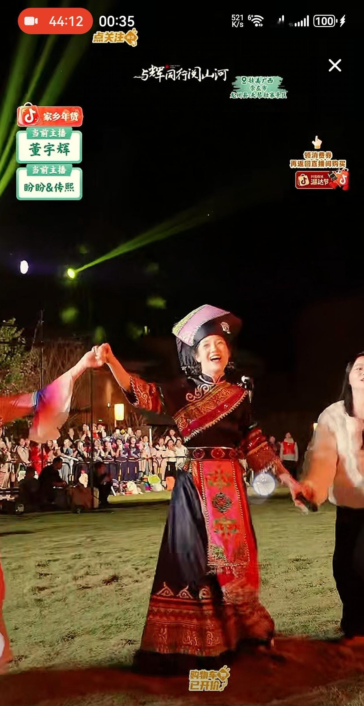 与辉同行阅山河广西行告别之夜,董宇辉和广西人民共创了一个歌舞欢腾浪漫之夜。 能歌善舞的壮族儿女,把最后的告别仪式整得热烈又接地气,董宇辉一边唱着山歌好比春江水,哪怕滩多浪又急,一边挽着手,跳着欢快的民族舞蹈,比起2023年桂林的跨年之旅,他离大家更近,更放松。看他在涠洲岛被太阳晒伤的脸,显然就是玩嗨了的样子。 有幸在2023年与董宇辉合影,这一次他再次来到我们的家乡,那是我们第1次追星,也曾留下这样难忘的相片,从来没有明星被要求和这样一大群人合影吧,大家愿和他同框,留住这难忘的时刻。 盼盼的少数民族着装总是那么出彩,她又像在云南行结束时那样狂舞,这种场合最适合她,好多次结束的时候,都是她站在宇辉旁仰望星空,观看烟花,志同道合的人,互为一生中的贵人。此次广西行最大的遗憾是没去看看她的真容,如此温婉大气的女子,可遇不可求。