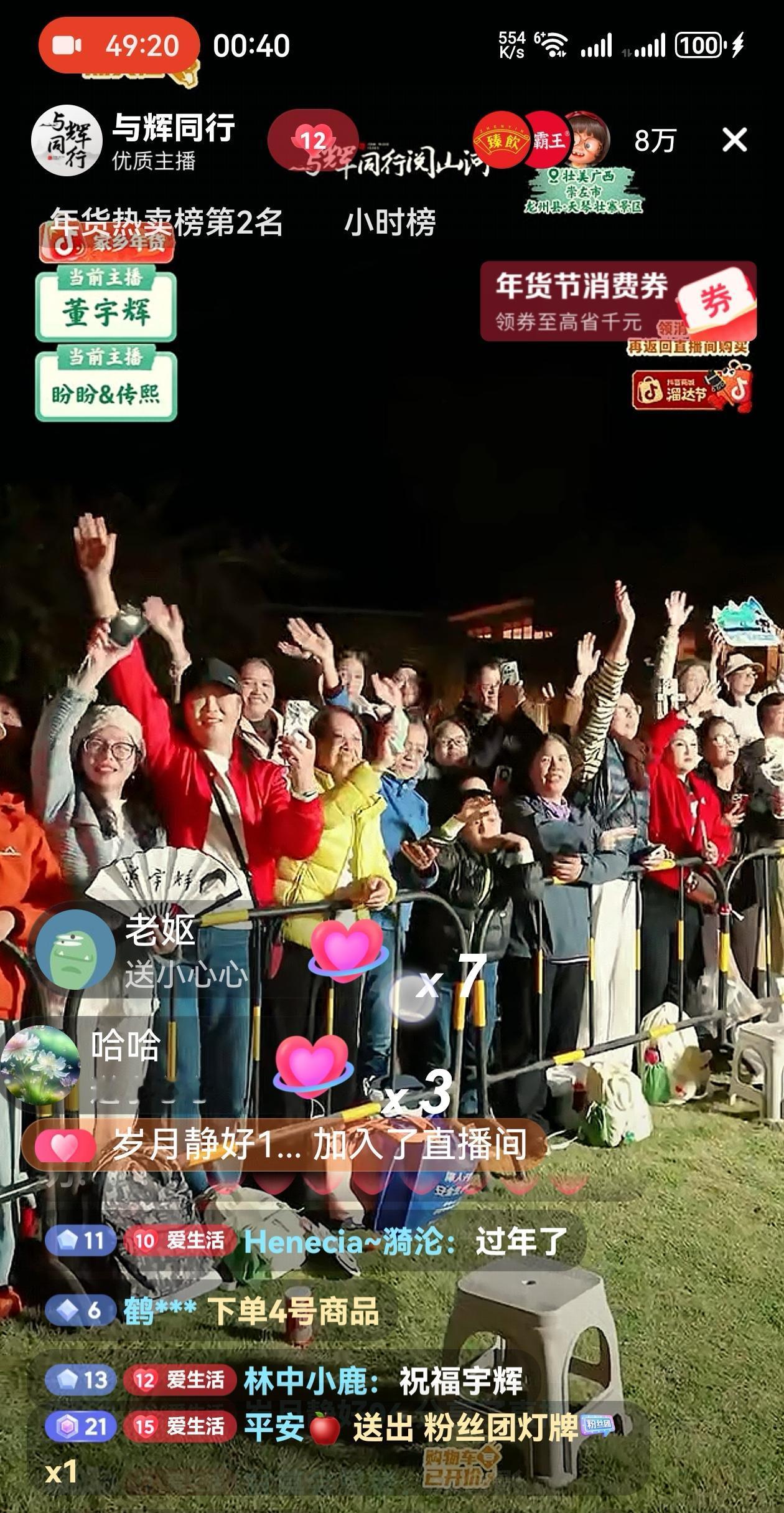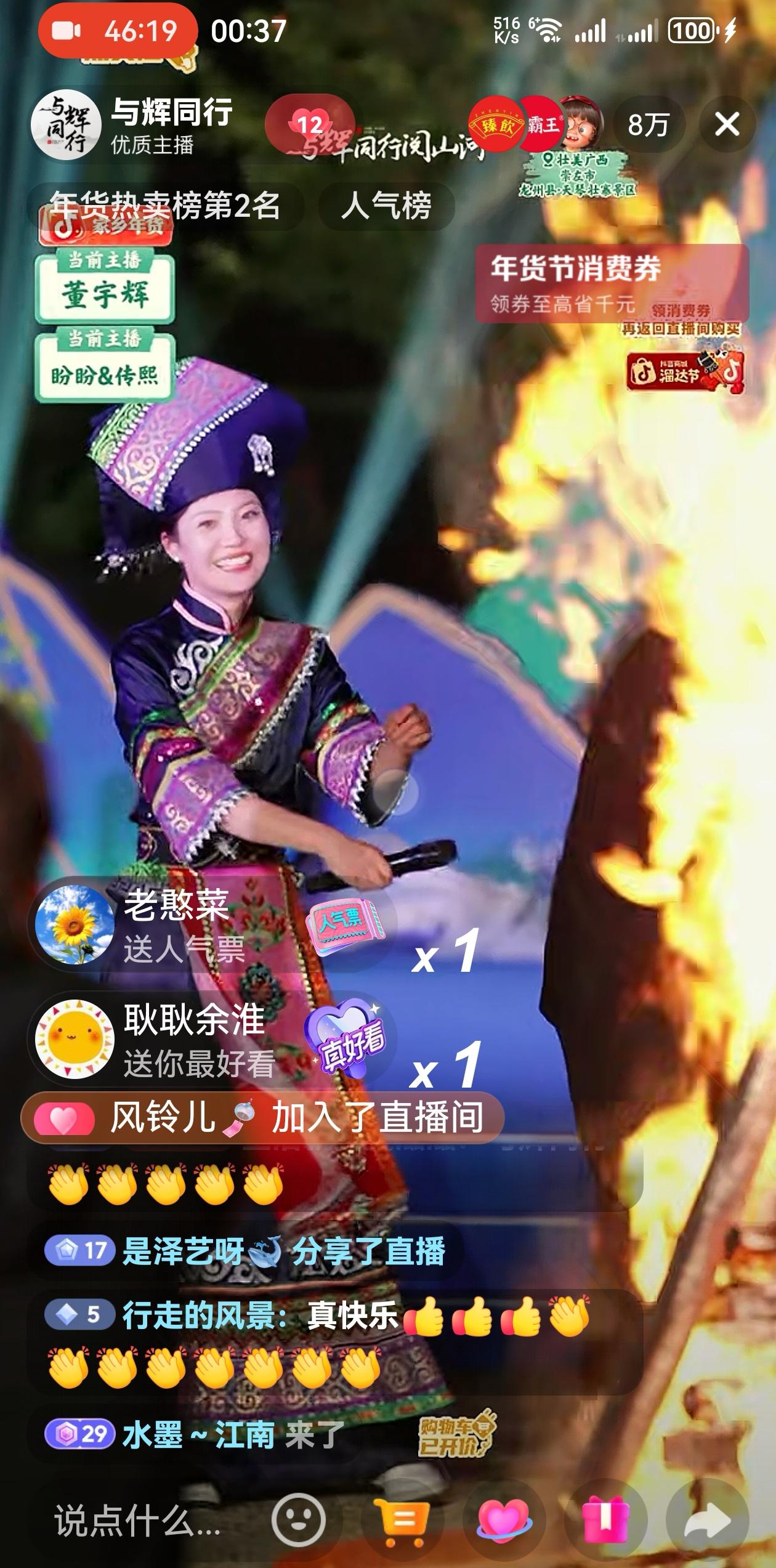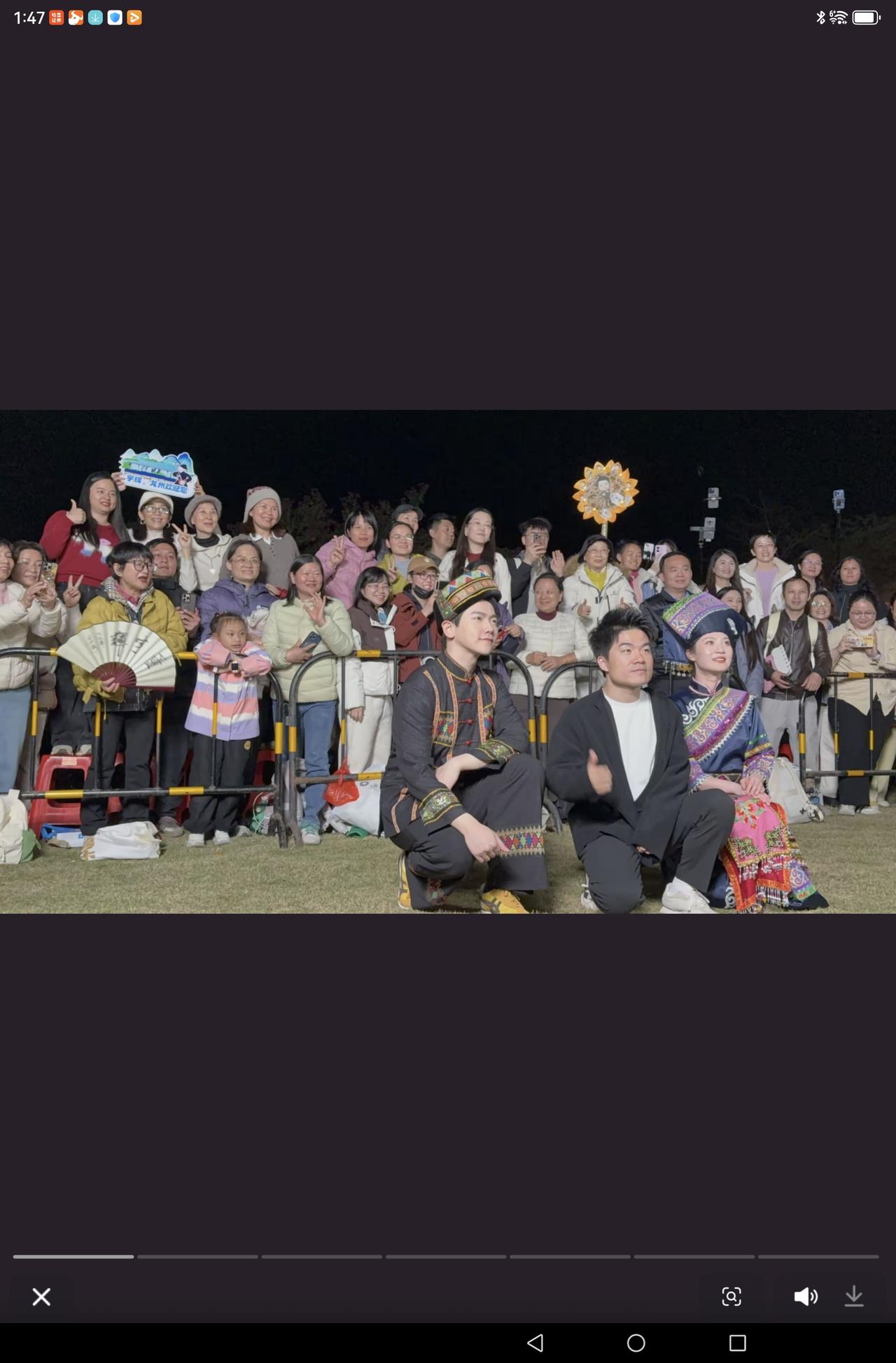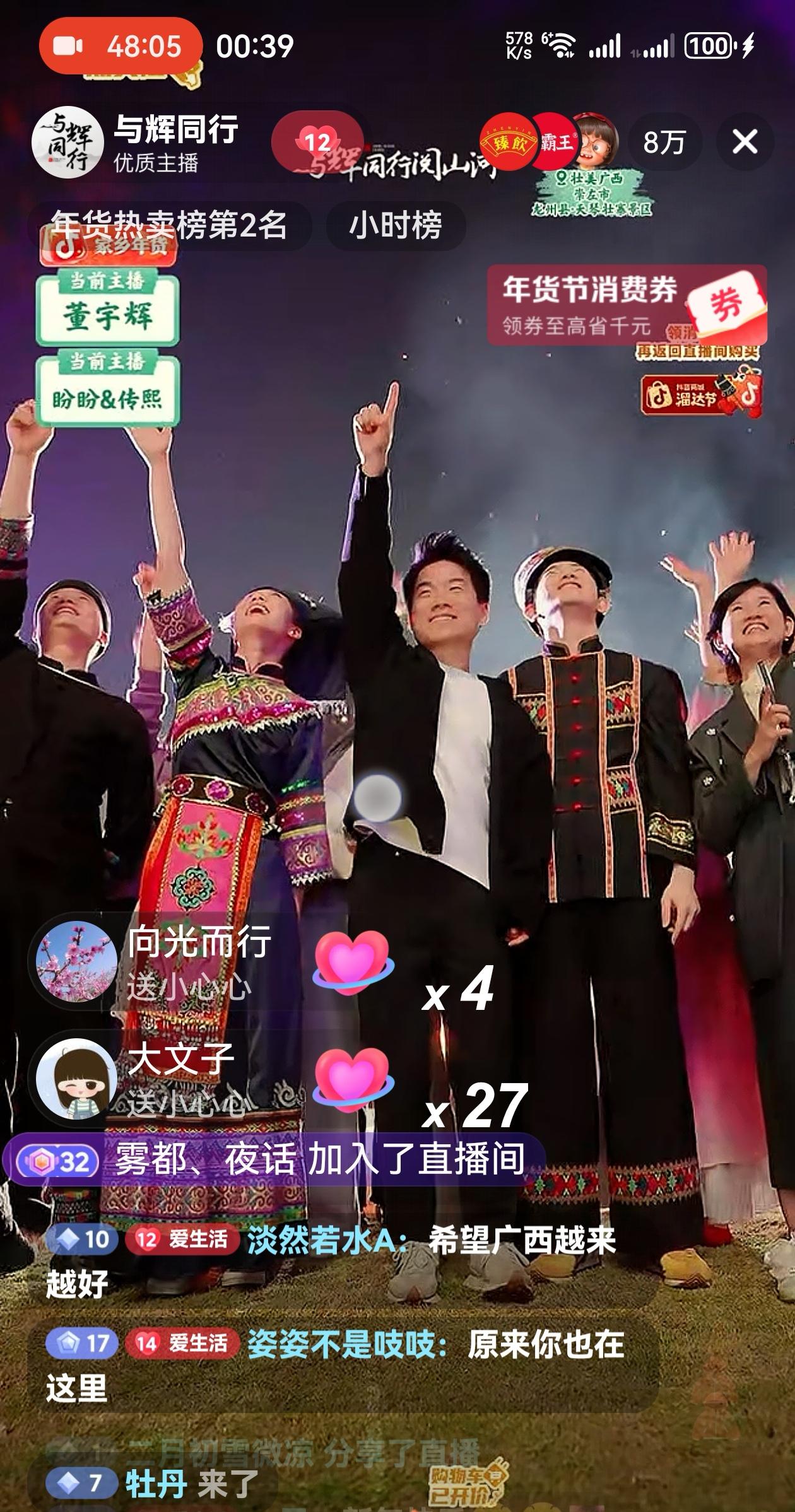 与辉同行阅山河广西行告别之夜,董宇辉和广西人民共创了一个歌舞欢腾浪漫之夜。 能歌善舞的壮族儿女,把最后的告别仪式整得热烈又接地气,董宇辉一边唱着山歌好比春江水,哪怕滩多浪又急,一边挽着手,跳着欢快的民族舞蹈,比起2023年桂林的跨年之旅,他离大家更近,更放松。看他在涠洲岛被太阳晒伤的脸,显然就是玩嗨了的样子。 有幸在2023年与董宇辉合影,这一次他再次来到我们的家乡,那是我们第1次追星,也曾留下这样难忘的相片,从来没有明星被要求和这样一大群人合影吧,大家愿和他同框,留住这难忘的时刻。 盼盼的少数民族着装总是那么出彩,她又像在云南行结束时那样狂舞,这种场合最适合她,好多次结束的时候,都是她站在宇辉旁仰望星空,观看烟花,志同道合的人,互为一生中的贵人。此次广西行最大的遗憾是没去看看她的真容,如此温婉大气的女子,可遇不可求。