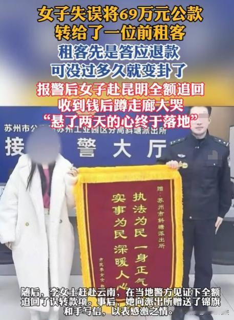 江苏苏州,一女子在转账操作时,她不小心输错账号,把69万公款转给了曾经的租客,女