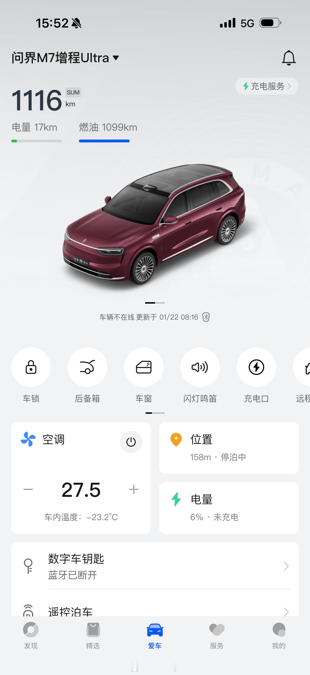 遇到个问题,问界M7之前剩10%电量没充,让我放外面冻没电了,车辆不在线手机钥匙