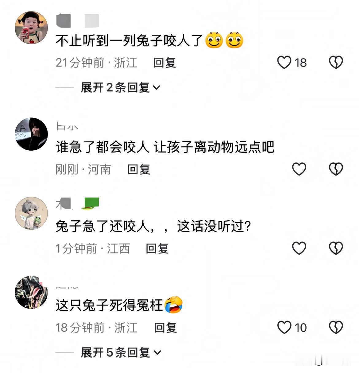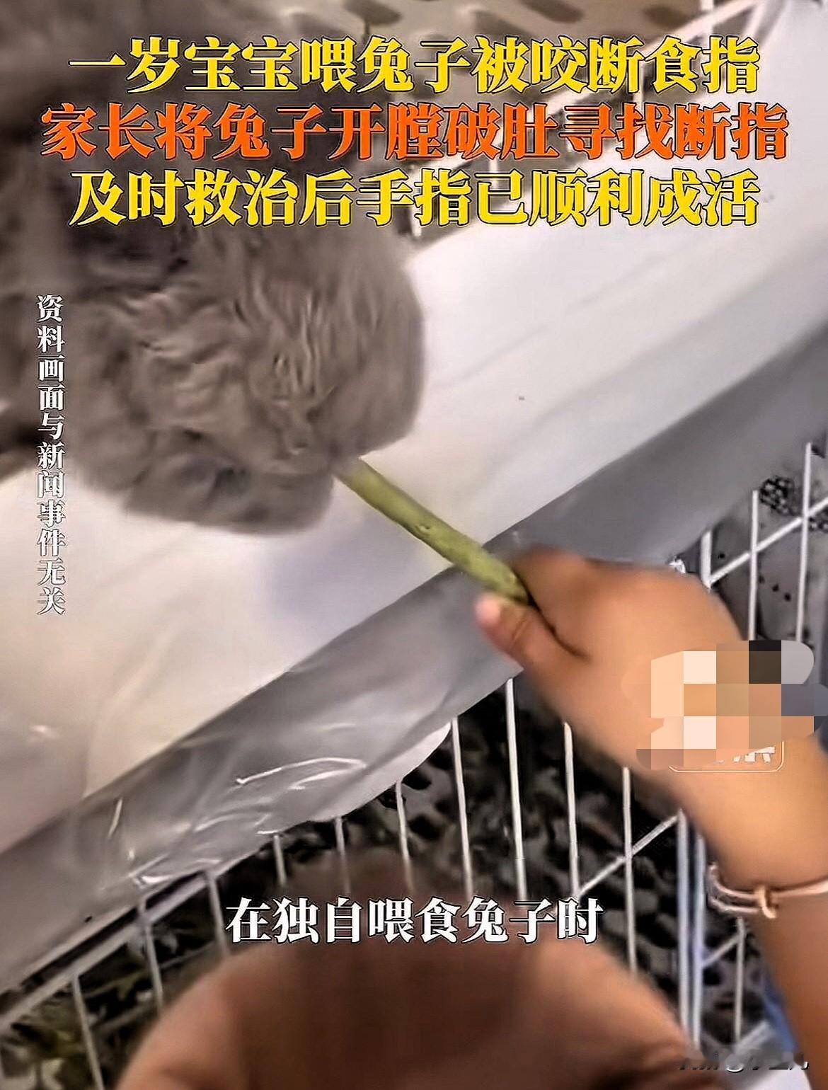 果然是兔子急了也咬人!河南郑州,1岁多的宝宝一不小心,居然被家里的兔子咬掉一截手指。家长为了找断指,把兔子剖腹,幸亏是找到手指,孩子也顺利接回。很多人第一反应是惊讶:“兔子不是很温顺吗?怎么也会咬人?” 但说句实在话,不是兔子突然变凶,是大人低估了风险。任何动物,本质都是动物。再小再乖,被抓、被喂、被刺激,都会本能反抗。更何况是一岁多的孩子,什么都不懂。 新闻里说,当时大人在厨房做饭,孩子自己拿着东西去喂兔子。这一刻的疏忽,差点换来一辈子的遗憾。 孩子不是故意,兔子也不是“作恶”。真正需要被反思的,是看护的缺位。 不是所有意外都能像这次一样幸运。孩子平安,是万幸;记住教训,才是责任。别再用“没想到”当理由。孩子的安全,不能靠运气。 关于这个事,大家怎么看呢? (新闻来源:四川观察)