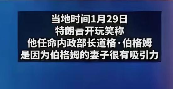 特朗普荒唐到什么程度?估计美国人都感觉他的言论太毁三观了! 这话一点不假。特朗普最近干的事,荒唐得让人目瞪口呆。 当地时间1月29号,特朗普任命了一个叫道格·伯格姆的人,当美国的内政部长。内政部长可是个大官,管着美国很多土地和资源。 你猜他任命这个人,理由是啥?说出来你都不敢信。特朗普说,是因为伯格姆的妻子“很有吸引力”! 这话一出,全世界都傻眼了。这哪像一个超级大国总统该说的话?选国家部长,不看能力,不看经验,居然是因为人家老婆长得好看?这简直就是把国家大事当儿戏,想怎么来就怎么来。 有网友试着帮他解释,说西方文化里夸人漂亮可能没那么严重。但就算文化有差异,把一个国家部长的任命理由,归结为“妻子有吸引力”,这也太离谱了。这已经不是简单的夸人,这是对公职的极端不尊重。 还有网友讽刺说,他连加拿大的主意都敢打,还想买格陵兰岛,把别国总统绑回来的话都说过。这么一比,任命一个部长因为看中人家老婆,在他那儿可能还真是“小菜一碟”。 这真不是东西方文化差异能说得通的。这纯粹是个人任性妄为,把公权力当成了满足自己私欲和喜好的工具。在他眼里,可能根本没有“公职”这个概念,国家就像他自己的私人庄园。 用咱们的三观,确实无法理解。也许就像有人说的,他们那套逻辑里,根本就没有“三观”这回事。这么搞下去,美国的国家信誉,真是被他一点点给败光了。