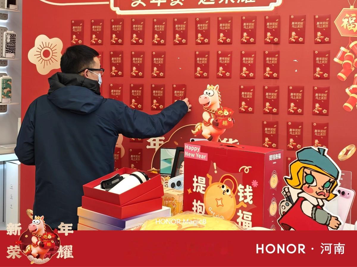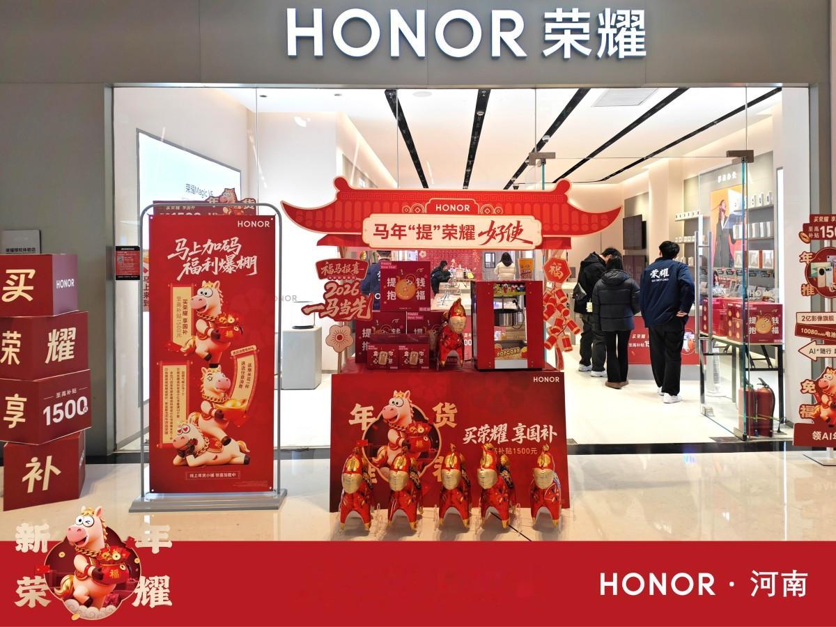 更值得关注的是,本次活动特别设置“进店打卡有礼”环节,消费者无需购机,只需到店完成打卡互动,即可限量领取联名周边,解锁潮流惊喜。同时,所有到店用户均可参与幸运抽奖活动,终极大奖为荣耀500手机,以重磅福利回馈消费者支持。多重权益的叠加,不仅让购机更具性价比,更通过丰富的互动形式,让线下门店成为新年消费的热门打卡地。