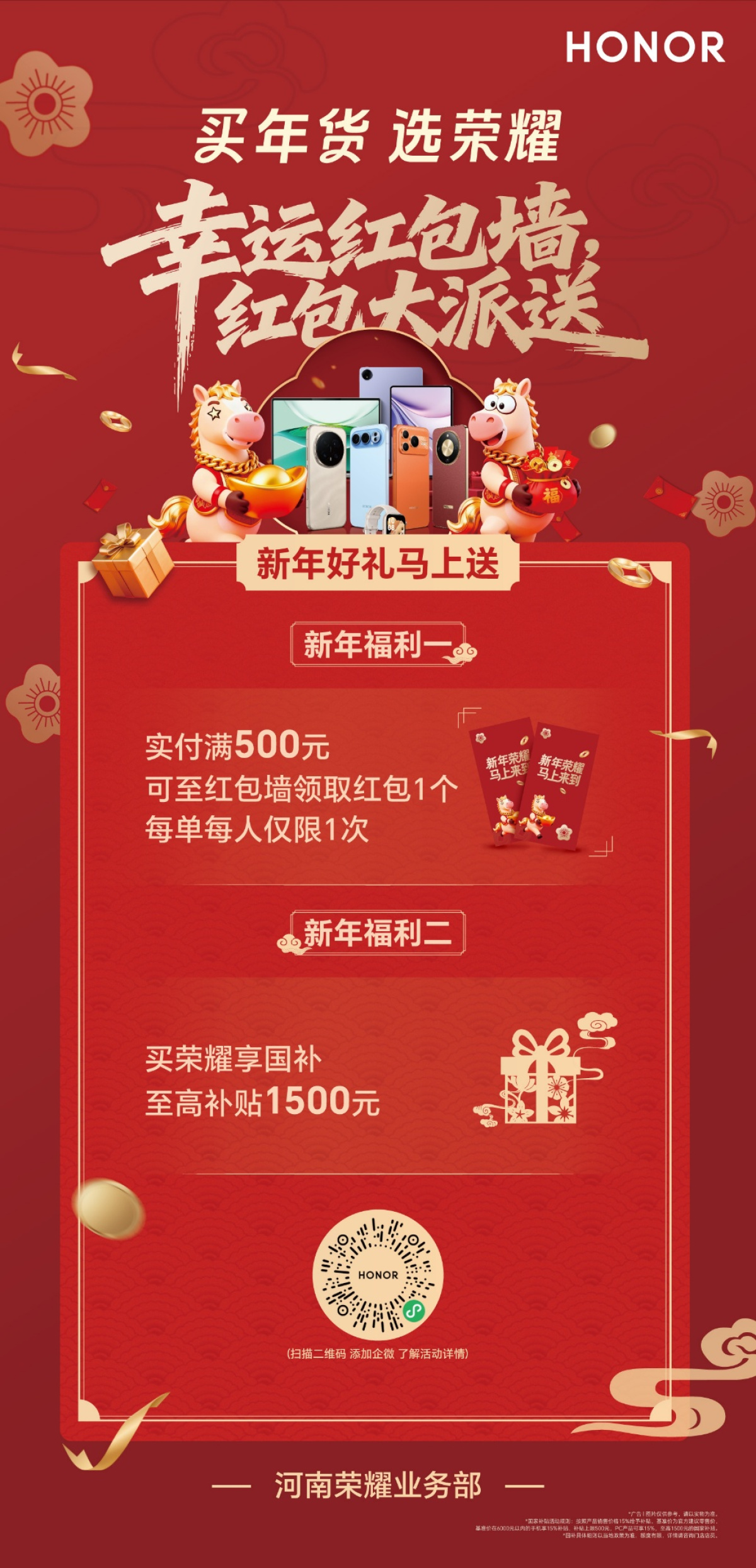 值此辞旧迎新之际,国家消费品以旧换新及数码产品购新补贴政策红利持续释放。荣耀正式启动“新年荣耀,马上来到”主题促销活动。活动深度融合国家补贴与品牌新年福利,通过“购机补贴、限定赠礼、进店抽奖”三重好礼,为广大消费者带来岁末年初的焕新盛宴。
