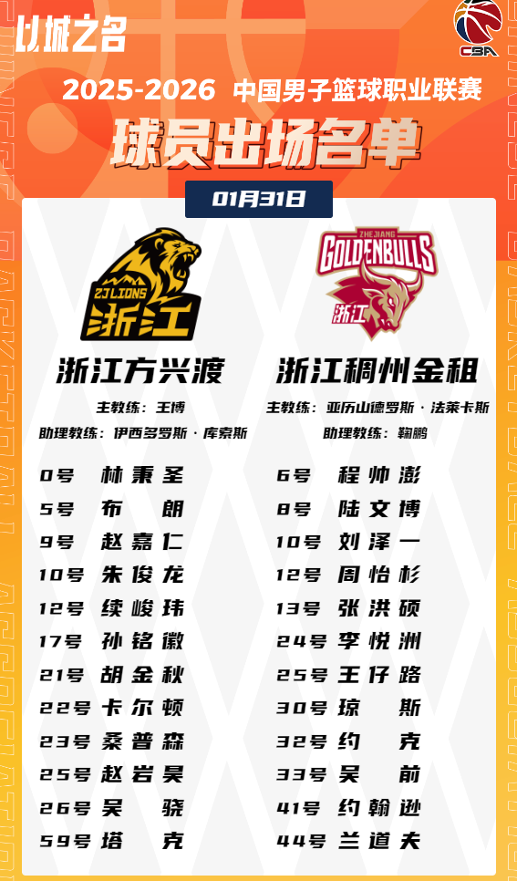 虎扑01月31日讯今晚CBA常规赛,广厦对阵浙江的大名单已经公布。