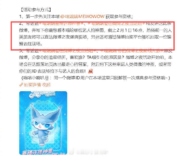 喵娲娲送了40张微博之夜门票 没想到离微博之夜最近的距离,就是跟紧喵娲娲的脚步!40张门票一送出,谁能不激动!邓为、黄子弘凡、刘宇宁、敖瑞鹏、时代少年团、TFING、登陆少年…这么多值得期待的艺人阵容,大家最想看到谁的精彩瞬间呢?