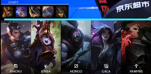 JDG选用:Xiaoxu贾克斯;JunJia赵信;HongQ乌鸦;GALA卡莎;Vampire露露