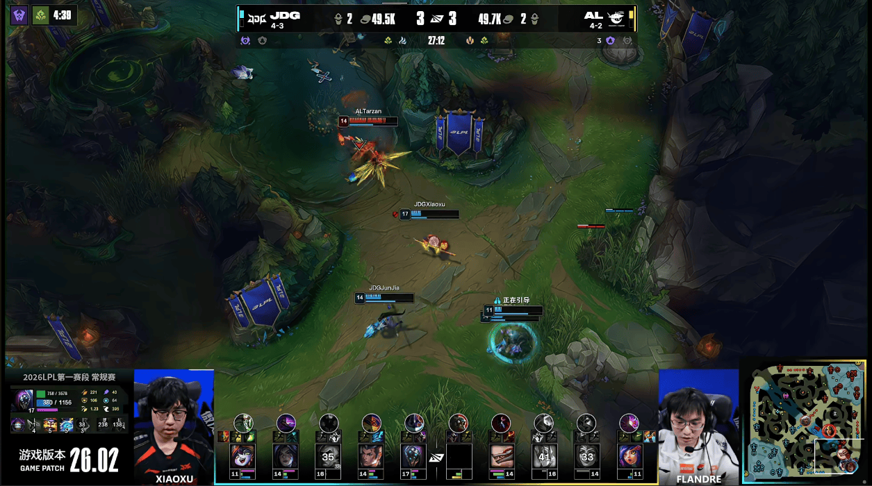 27分钟,AL团战阵型脱节,JDG上中两人轮流顶住JDG团战完成1换2
