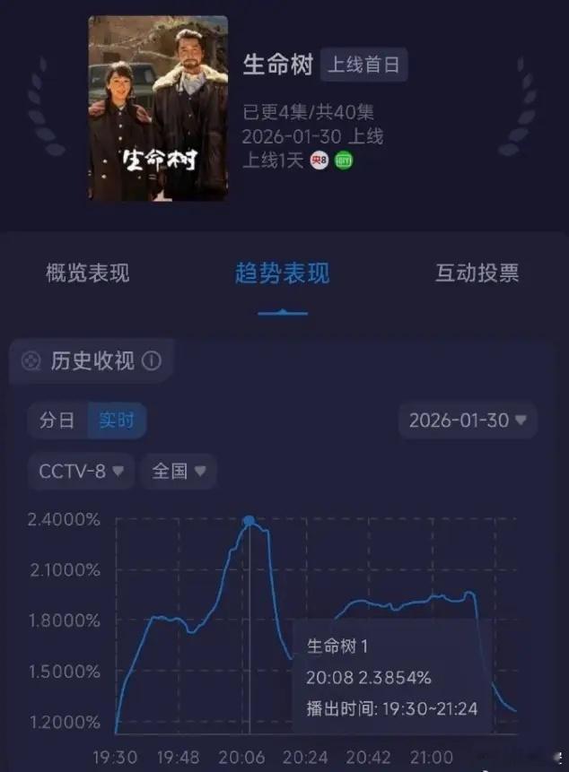 杨紫《生命树》首播成绩!爱奇艺站内热度最高6168,爱奇艺首页给固4屏,粉丝云包场10万+,首播6广,49秒,首日酷云平均收视率1.803%,目前来看首播热度和收视率有点滑铁卢,赵丽颖《小城大事》首播酷云收视率是2.2348%,大结局酷云平均收视率是2.1%,《生命树》更低一些,所以首播CVB也高不了,需要等后期剧情口碑发酵了。
