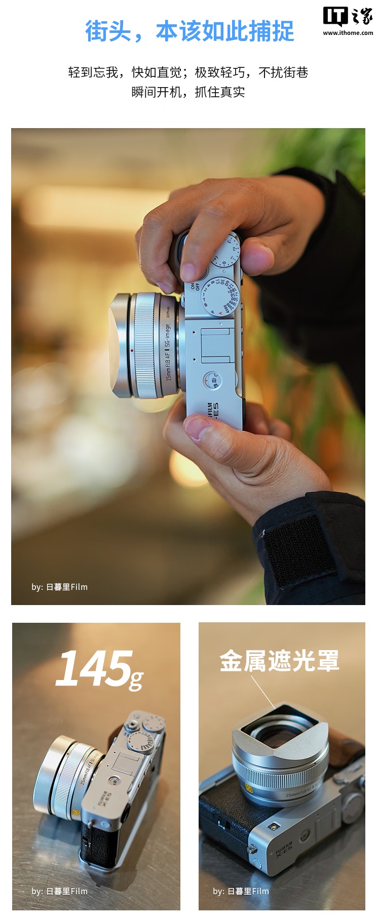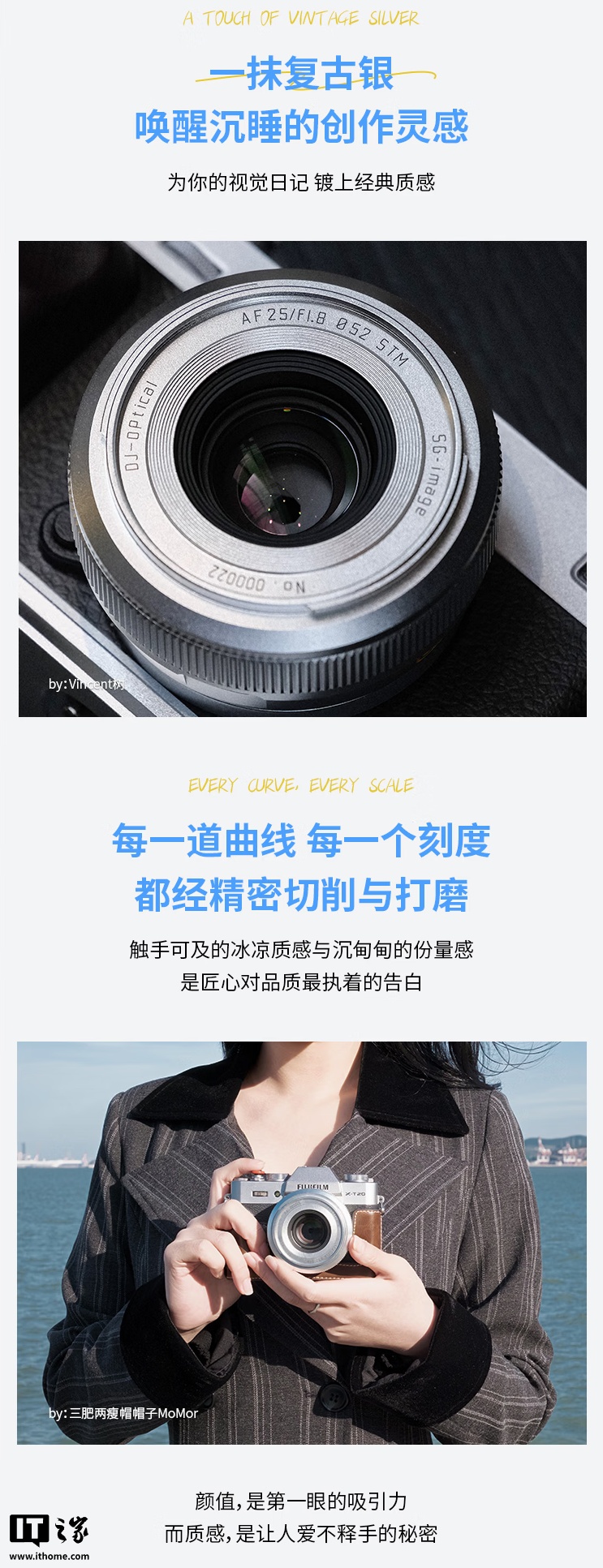 据介绍,这款镜头采用复古银配色,更适配浅色机身,最大光圈可达f/1.8,可在夜晚等光线不足场景接收更多光线,等效全画幅焦距则是37.5mm,接近35mm视角,适合人像、街拍、风光等摄影题材。