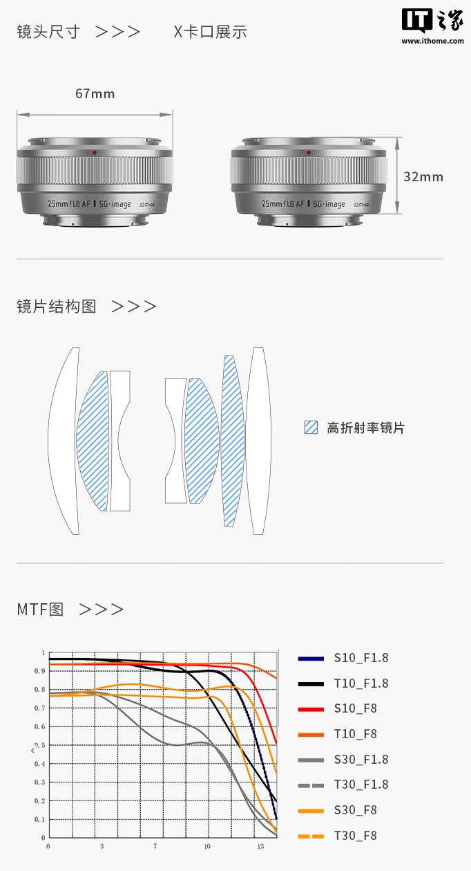 规格方面,这款镜头的最近对焦距离是0.3m,能够拍摄更多近物,重量145g,方便用户日常挂机扫街,采用5组7片的光学设计,其中带有3枚高折射率镜片,镜身则是全金属材质,自带金属遮光罩。