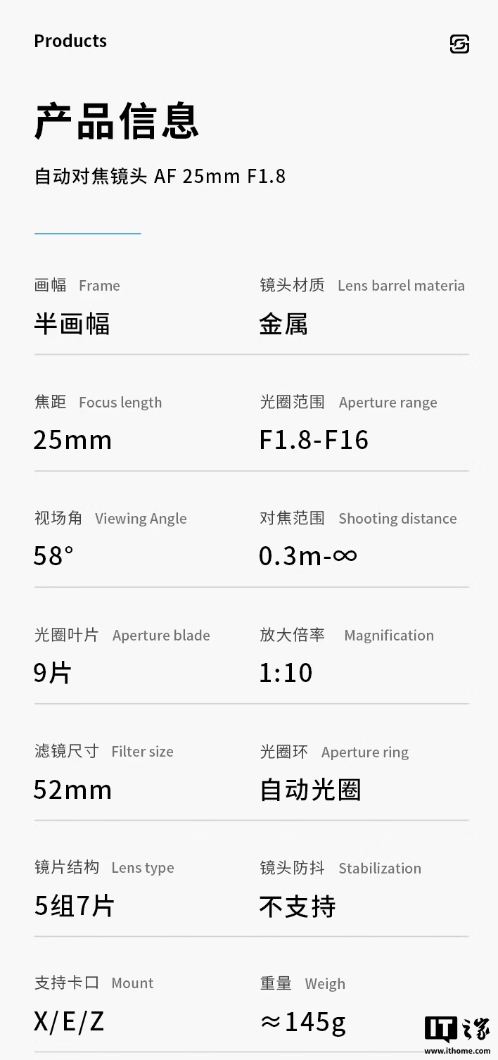 IT之家1月31日消息,深光影像现已推出AF25mmf/1.8半画幅自动对焦镜头,新品主打145g轻薄设计,适配索尼E/尼康Z卡口,富士X卡口版暂未上架,标价669元,首发售价599元。