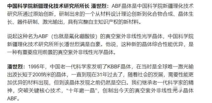 中国又多了一张王牌! 根据消息,中科院潘世烈团队经过近十年,攻克了氟化硼酸铵(ABF)晶体难点,创下三项世界纪录,首次实现158.9纳米直接倍频真空紫外激光输出。 目前。我们从材料设计到加工测试全程自主攻关,最终才破解行业难题,这就意味着,中国 又有一项技术世界领先了。 有些人可能不理解这项技术有多强。 但你要知道,激光是20世纪人类重大发明,堪称“万能工具”:大到国防激光拦截、制导,小到手机芯片刻字、键盘雕刻,还有汽车、航天发动机焊接、精密部件切割,甚至医院激光手术,处处都离不开它。可以说,激光渗透在生活和国家硬核实力的方方面面,没有它,很多高端科技都会停摆。 而非线性光学晶体——这玩意儿就是激光的“转换器”,能通过倍频效应,把常见波长激光转换成更短或更长的波长。 在晶体领域,中国本就来世界领先,甚至实现垄断,打造了从原料合成到镀膜的完整产业链,上中下游一条龙,一点机会都不给他人留,这就是咱们领跑的底气! 比如咱们研究的KBBF晶体,就成为欧美难以突破的技术 过去30多年,全世界只有它能通过直接倍频产生200纳米以下激光。咱们曾卡了美国17年脖子,2009年禁止出口后,美国花重金攻关,直到2016年才搞出类似晶体,却没有配套技术,根本没法实用。 也正因KBBF,中国成为唯一能制造使用深紫外全固态激光器的国家,目前,深紫外全固态激光器已经在石墨烯、高温超导、拓扑绝缘体、宽禁带半导体和催化剂等一系列重大研究领域中获得了重要结果,也正因为中国在激光晶体技术上的遥遥领先,中国在激光武器领域,也是处于全球领先位置。 而这次的ABF晶体,比KBBF更猛,这意味着中国激光器性能将远远超过其他国家,具体可以看下一篇