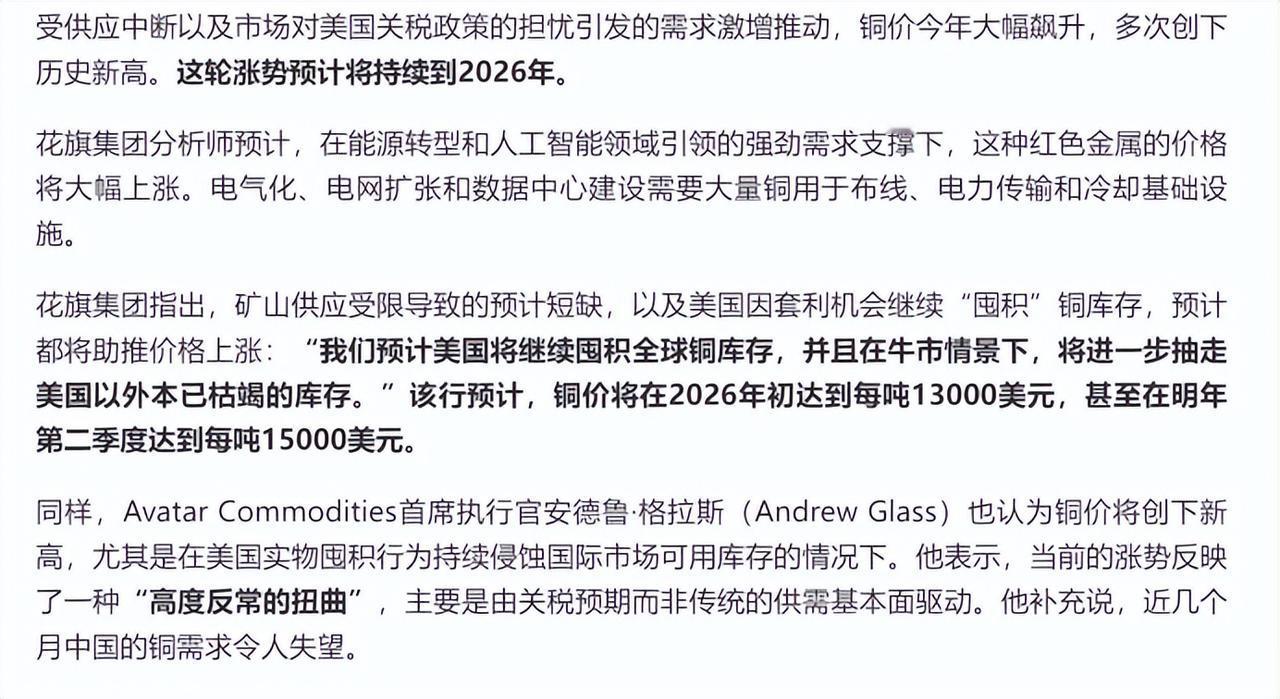 美国是铁了心要在铜上搞事。 2026年刚开场,直接创下每吨12543美元的历史新高,后续还在一路狂飙。 大家可能不知道,铜价上涨的背后,其实美国暗中操盘,甚至是一场针对中国工业的金融围猎。 为啥这么说呢?第一铜已经成为“工业黄金”。 可能有人会问,不就是个铜吗,有这么大价值吗?咱跟你说,还真至于!中国现在全力搞的未来产业——新能源、数字经济、人工智能,哪一个都离不了铜。为啥?因为铜是电和热的“超级搬运工”,比别的金属都好用,导电导热本事没人能比。 你看电动汽车,电机、电缆都得用大量铜,用量比传统汽车多好几倍;太阳能、风力发电,还有电的输送,没铜根本玩不转;数字经济的家底,数据中心、5G基站,还有芯片散热,离了铜的导电导热本事,根本跑不起来;就连人工智能的算力,看着高大上,背后得靠庞大的电力和散热系统撑着,铜还是核心中的核心。 正是因为它在工业领域的至高作用,因此第二个信号也很明显了,那就是美国希望通过控制铜延缓或者卡住中国制造发展(是美国操盘的一场针对中国工业的金融围猎。)。 咋回事呢? 现在中美都在抢工业革命的主导权,这些产业就是未来的底气,要是缺了铜,制造成本就得暴涨,产能也上不去,中国产业升级、科技突破就得被卡脖子。可要命的是,中国80%以上的铜都得靠进口,相当于脖子一直被别人攥着,而美国就是瞅准了这个软肋,才动起了歪心思。 更巧的是,这几年全球铜矿早就供需失衡了,给了美国可乘之机。智利、秘鲁这些主要产铜的国家,老出生产事故,供应端直接紧得离谱,创下了历史级的紧缩;而且全球铜矿的资源品位还在一个劲下降,挖出来的铜越来越少,开采成本也越来越高。 总之啊,敌人忘我之心不死,我们也要多加防范。
