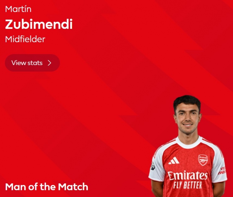 率先破门,英超官方:苏维门迪当选阿森纳4-0利兹联全场最佳球员