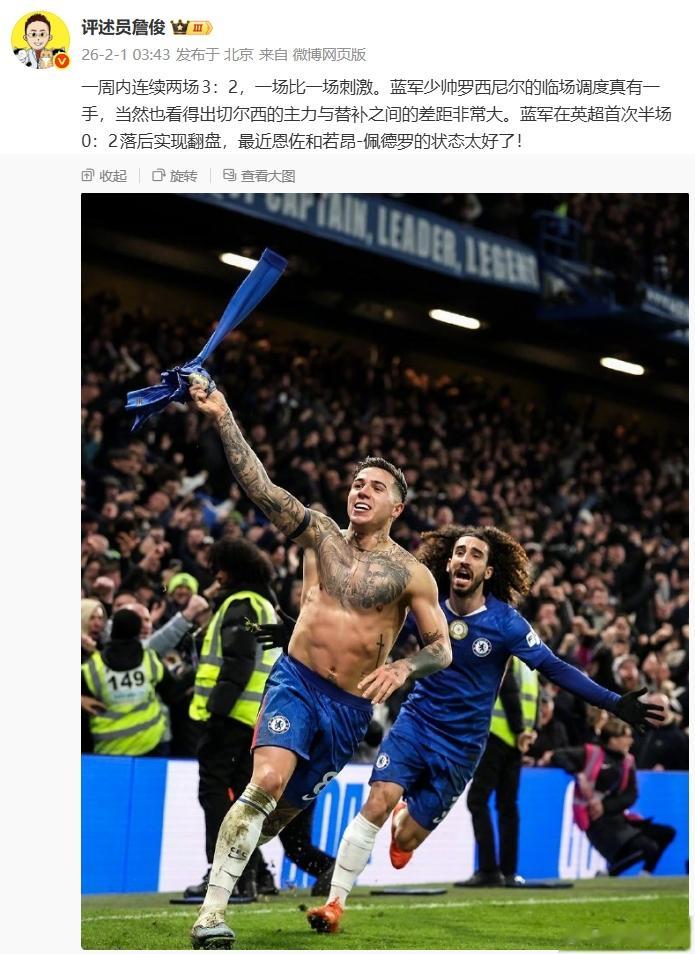 詹俊:“一周内连续两场3:2,一场比一场刺激。蓝军少帅罗塞尼尔的临场调度真有一手,当然也看得出切尔西的主力与替补之间的差距非常大。蓝军在英超首次半场0:2落后实现翻盘,最近恩佐和若昂·佩德罗的状态太好了!”