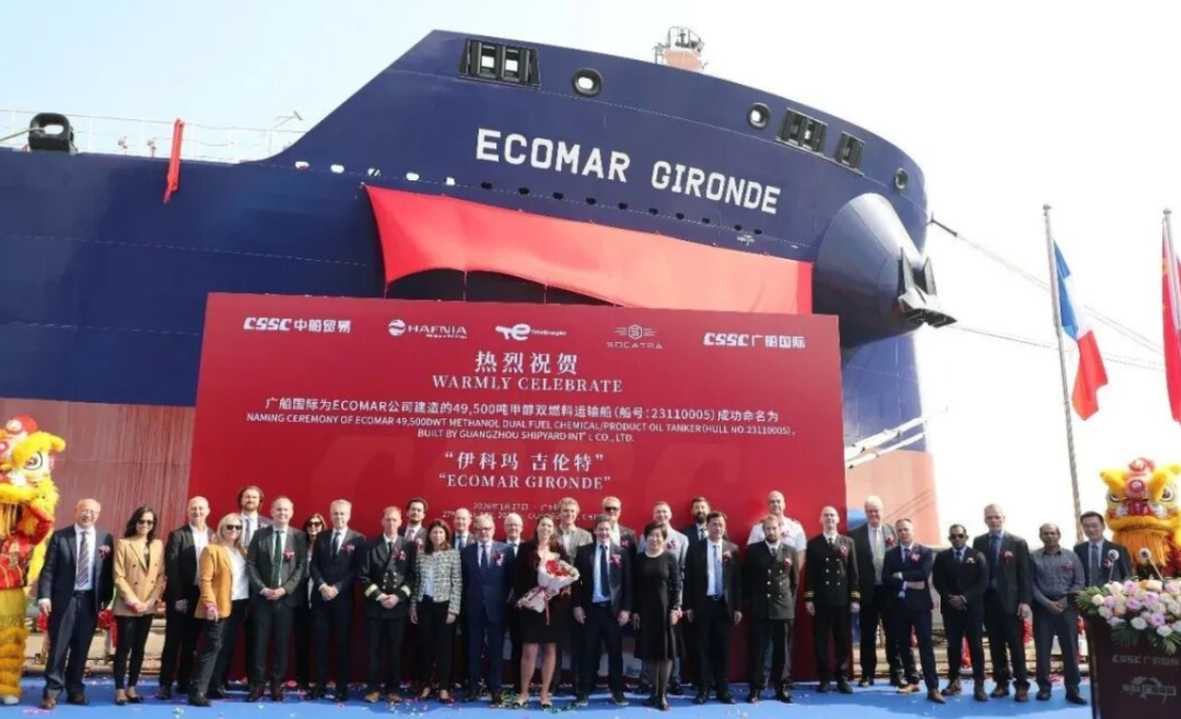 1月27日,中船广船国际联合中船贸易为新加坡HAFNIA和法国SOCATRA创立的合资公司ECOMAR建造的4.95万吨甲醇双燃料化学品船4号船举行命名交付仪式,新船被命名为“ECOMARGIRONDE(伊科玛吉伦特)”号。随着该船交付,标志着该项目4艘船建造圆满收官。