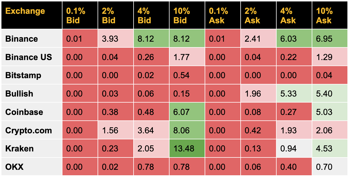 根据Kaiko的数据(图1)订单簿深度显示,一些交易所的“比特币流动性在各个价位上几乎为零” — —除了币安、Crypto.com和Kraken等主要交易所外,其余交易所在4%价差范围内几乎没有买单。这种流动性稀薄意味着每次强制抛售对价格的冲击都更大。此外,跨平台风险管理与套利功能也遭遇障碍。
