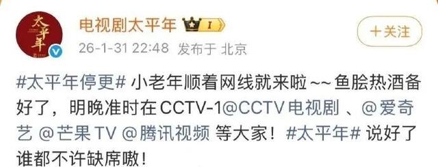 1月31日晚,#太平年停更#登上微博热搜,随后@电视剧太平年发博回应:小老年顺着网线就来啦~~鱼脍热酒备好了,2月1日晚准时在CCTV-1@CCTV电视剧、@爱奇艺@芒果TV@腾讯视频等着大家,说好了都不许缺席嗷。