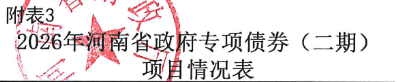 2026年河南省政府专项债券(二期),(详见附表3)。