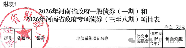 2026年河南省政府专项债券(三至八期),(详见附表1)。