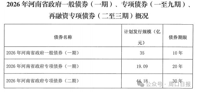 1月29日,河南省财政厅披露信息,经河南省人民政府同意,决定发行2026年河南省政府一般债券(一期)、专项债券(一至九期)、再融资专项债券(二至三期)。