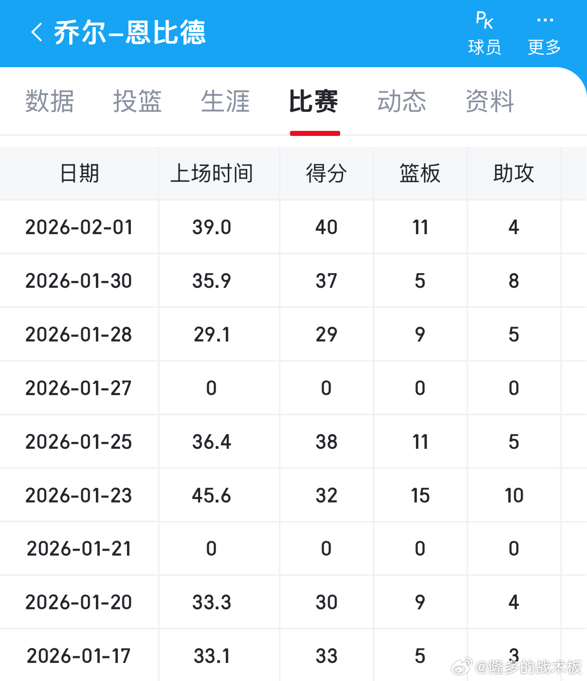 恩比德今日对阵鹈鹕狂砍40分11板,最近7场比赛有6场取得30+😯