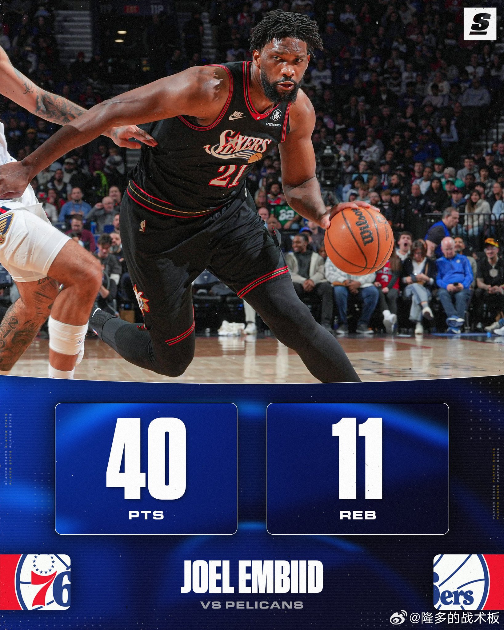 恩比德今日对阵鹈鹕狂砍40分11板,最近7场比赛有6场取得30+😯鹈鹕vs76